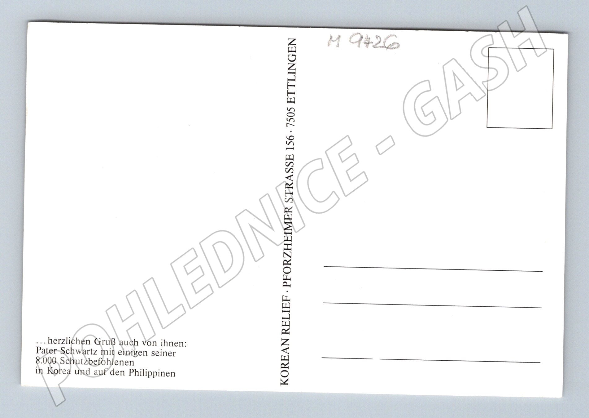 Barevná pohlednice zobrazující skupinku dětí s dospělým mužem, pravděpodobně dobrovolníkem nebo misionářem, v zahradě nebo parku. Na zadní straně je uveden text v němčině, který zmiňuje otce Schwartze a několik jeho svěřenců v Koreji a na Filipínách. Jedná se o poctu humanitární práci s dětmi v Asii. Pohlednice nebyla použita (neprošlá poštou), je ve velmi dobrém stavu, rozměr klasický pohlednicový formát. Vhodné pro sběratele tematických asijských pohlednic i zájemce o humanitární témata.