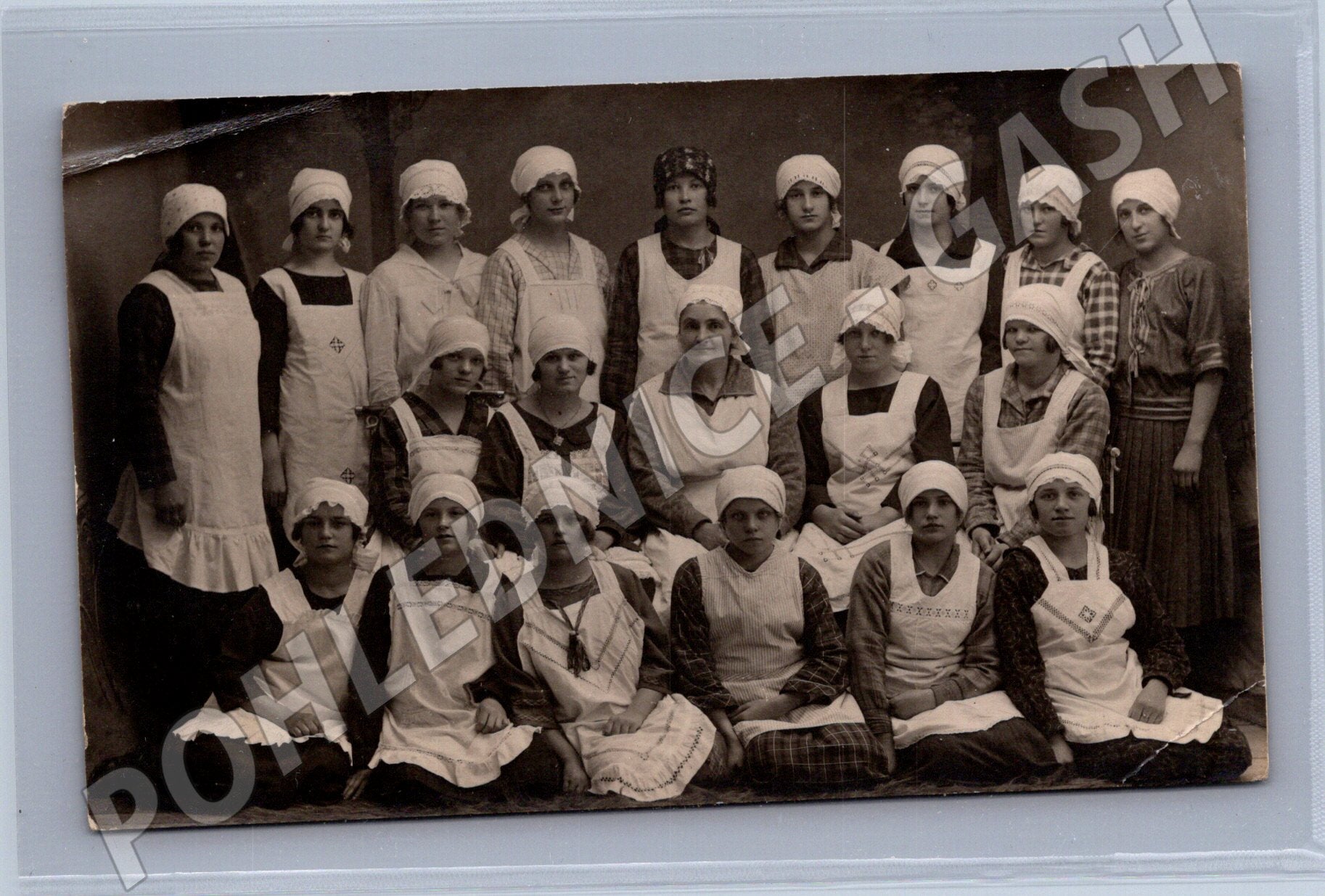 Unikátní černobílá pohlednice z období let 1925–1927 zachycuje skupinu mladých žen a dívek v dobových šatech a zástěrách, pravděpodobně z prostředí školy nebo kurzu vaření či šití. Všechny ženy jsou naaranžovány posedávající i stojící v několika řadách před neutrálním pozadím, včetně některých s typickými čepečky a plášti. Pohlednice je ve velmi dobrém sběratelském stavu, pouze s drobným ohybem v rohu a lehkým opotřebením. Zadní strana je čistá, neprošlá poštou, s rukopisným označením let 1925–27. Vhodné pro sběratele dobových a etnografických pohlednic nebo zájemce o historii každodenního života první republiky.