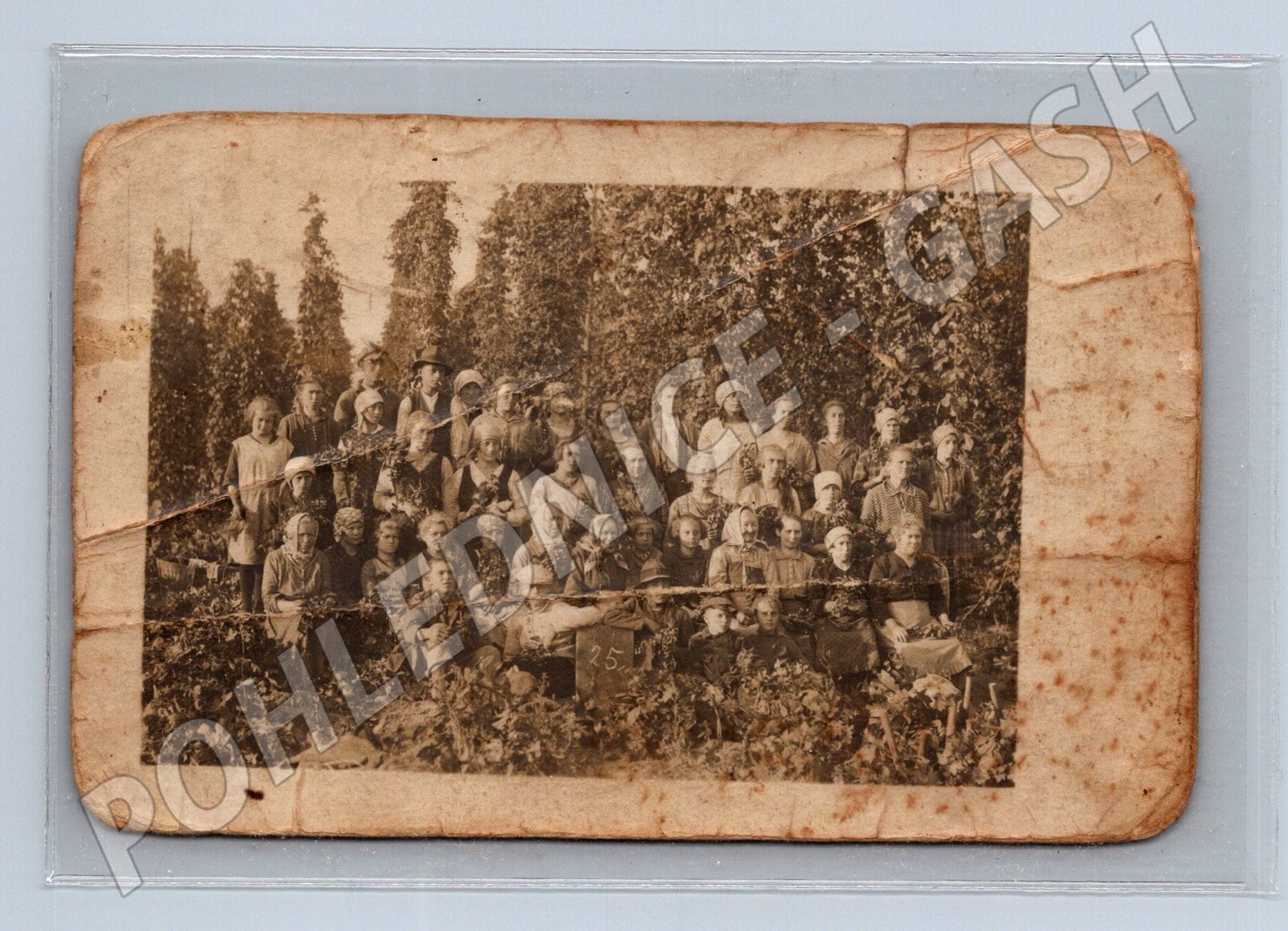 Stará černobílá pohlednice zachycující skupinu žen a mužů při práci na poli, pravděpodobně při sklizni chmele nebo jiné zemědělské činnosti. Fotografie pochází z první poloviny 20. století, odhadem kolem 1920–1940. Pohlednice nese výrazné známky stáří – ohyby, skvrny, zažloutnutí a částečné poškození rohů. Na zadní straně je rukopisné označení a možné věnování. Cenný etnografický dokument ukazující každodenní život a práci na venkově minulé éry, vhodné pro sběratele a milovníky historie. Josef Koldo