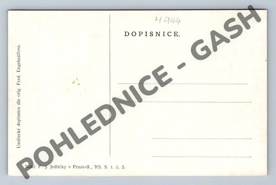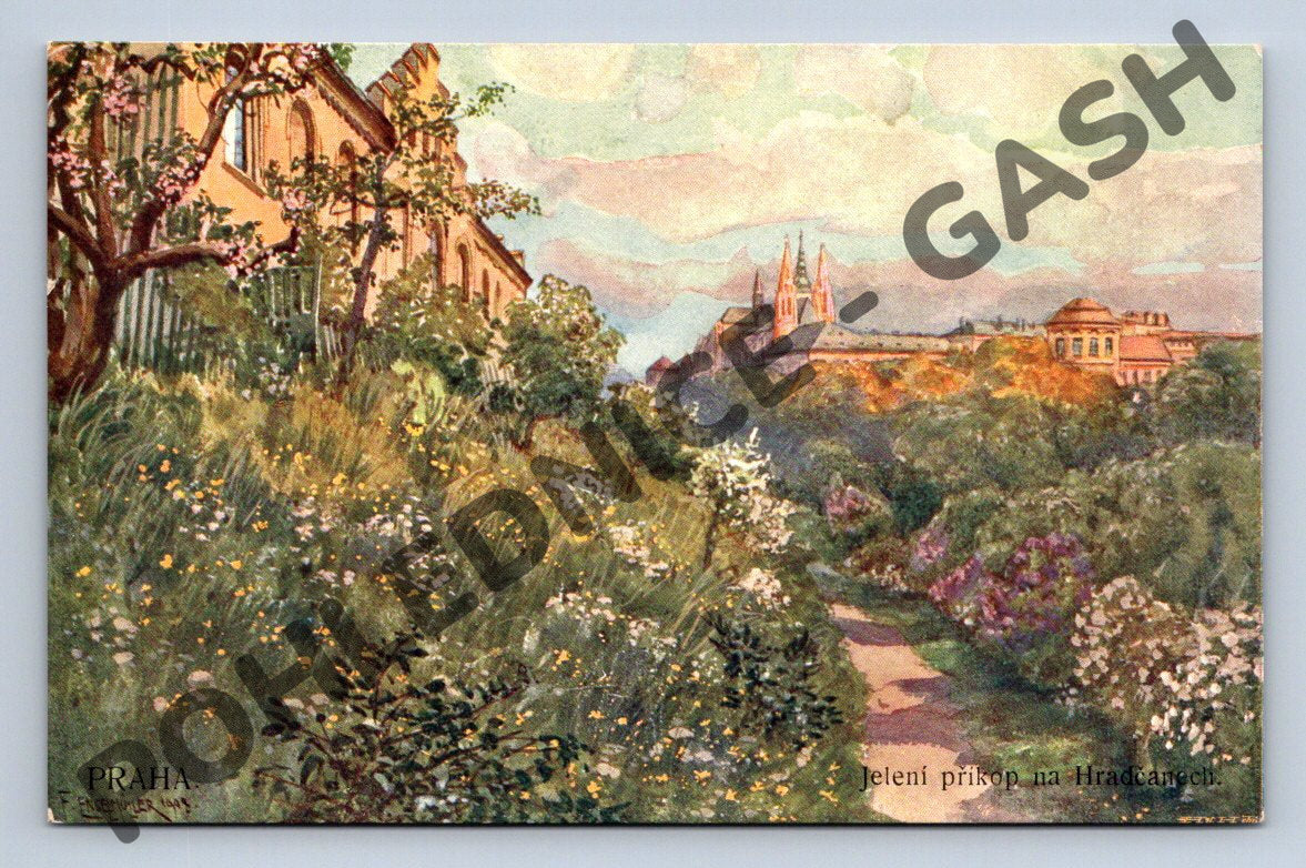 Umělecká pohlednice zobrazující Jelení příkop na Hradčanech v Praze. Překrásná malířská ilustrace s pohledem na Pražský hrad a okolní zahrady. Na pohlednici je jemně znázorněná rozkvetlá zeleň, historické budovy a panorama města. Vydal F. J. Jedlička, Praha, kolem roku 1910–1930. Zadní strana je nepsaná, určeno pro dopisnici. Výborný stav, sběratelsky atraktivní pohlednice pražského výhledu.