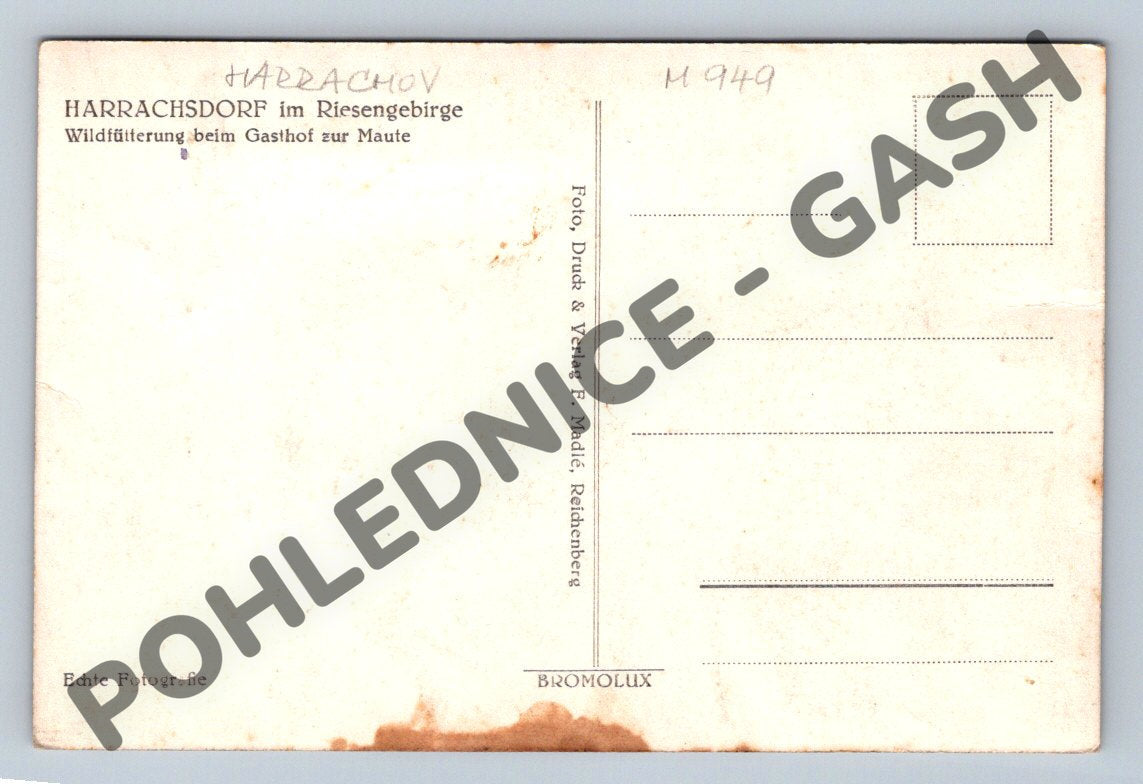 Originální stará černobílá pohlednice s motivem jelenů v zimní krajině s podavačkou na seno, Harrachsdorf (dnes Harrachov) v Krkonoších. Na přední straně je nápis Hochwild im Riesengebirge, Revier Harrachsdorf . Jedná se o pohlednici skutečné fotografie (Echte Fotografie), tištěnou Foto, Druck & Verlag F. Madlé Reichenberg. Na zadní straně ručně dopsaný název a místo pro známku a adresu. Pohlednice je ve slušném sběratelském stavu, mírné opotřebení na okrajích. Vhodná do sbírky pohlednic s tématem zvířat či hor.