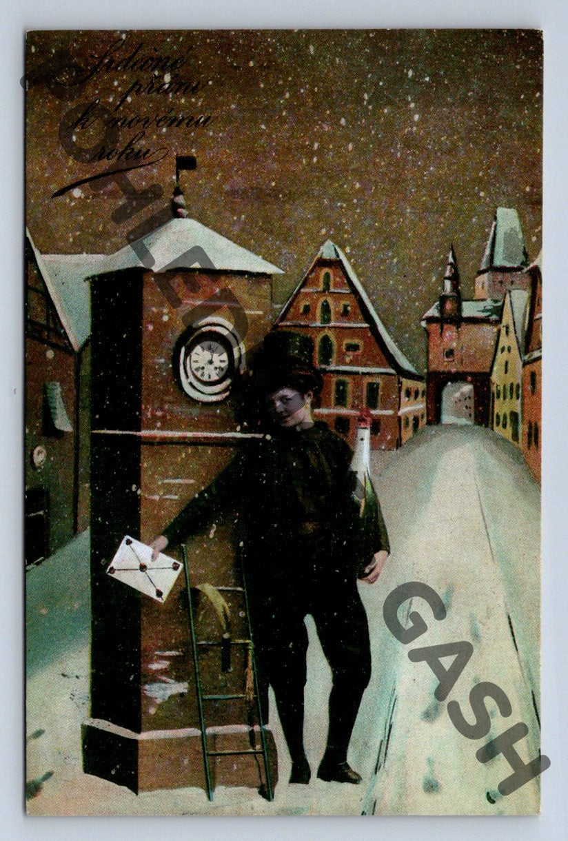 Originální novoroční pohlednice z roku 1994 představuje ilustraci kominíka lezoucího po zasněžené střeše s hodinama, v pozadí historické město. Na zadní straně je dopis s přáním ke komínku, štěstí a zdraví do nového roku, spolu s poštovní známkou ČR a adresou. Jedná se o reedici historických pohlednic, vydáno TIP Ústí nad Orlicí, EXPRINT Červený Kostelec. Atraktivní sběratelský kousek s krásnou kresbou v zimní atmosféře a autentickou dobovou korespondencí.