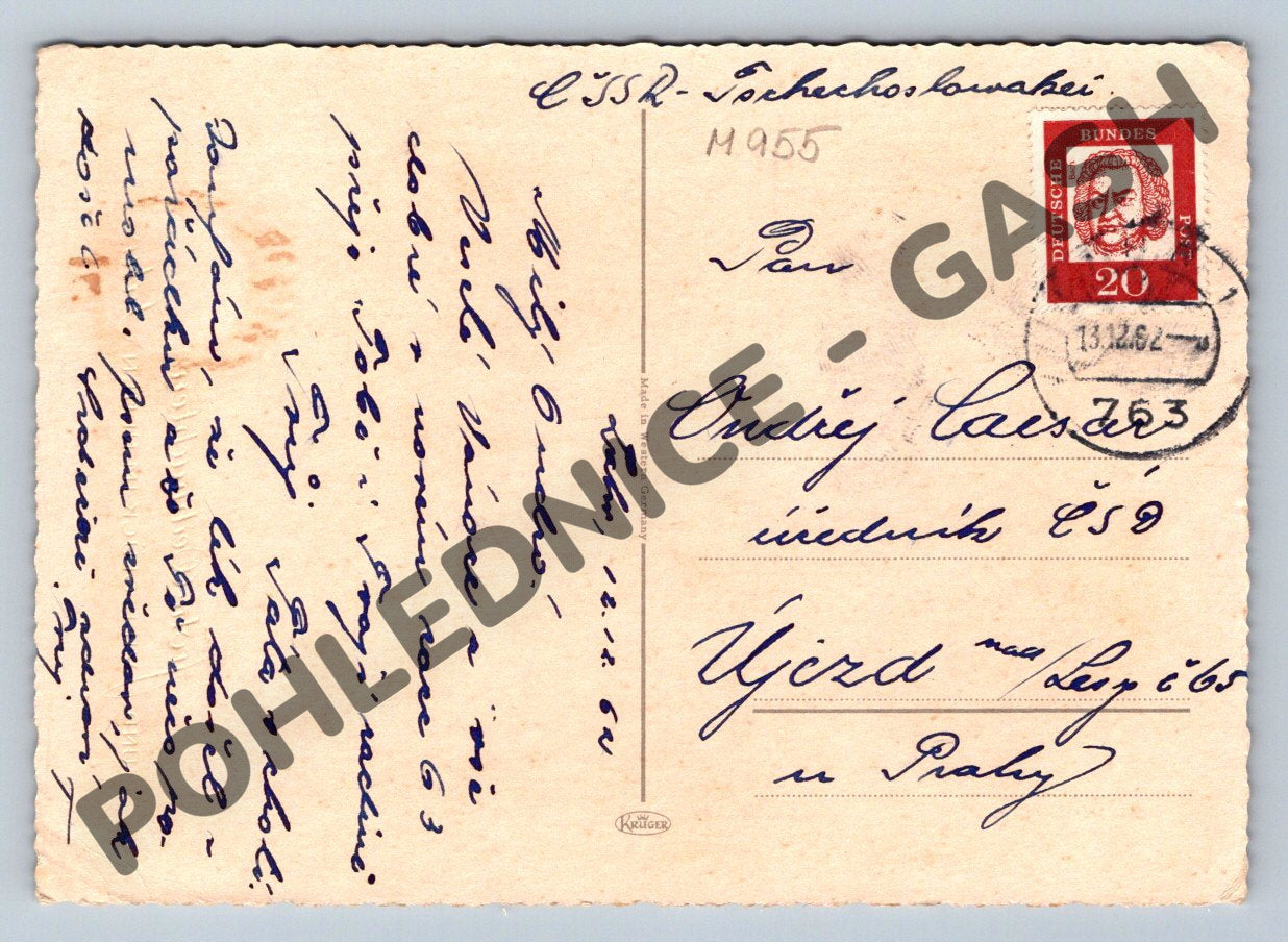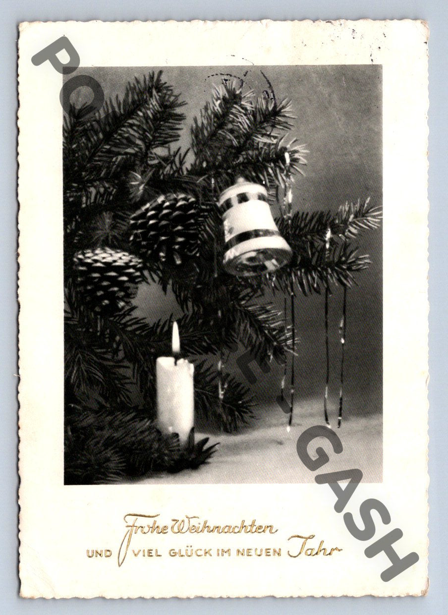 Originální vánoční pohlednice zaslaná z Německa do Československa, datovaná 13. 12. 1962. Na přední straně se nachází černobílá fotografie vánoční výzdoby: větvička s šiškami, svíčka a ozdoba. Pohlednice je s německým přáním Frohe Weihnachten und viel Glück im neuen Jahr (Veselé Vánoce a hodně štěstí v novém roce). Na zadní straně naleznete německou známku a ručně psané věnování v češtině adresované do Újezda nad Lesy (Praha). Velice pěkný sběratelský kousek se známkou, razítkem a dobovým textem. Stav viz foto. Vhodné pro sběratele i milovníky historie a Vánoc.
