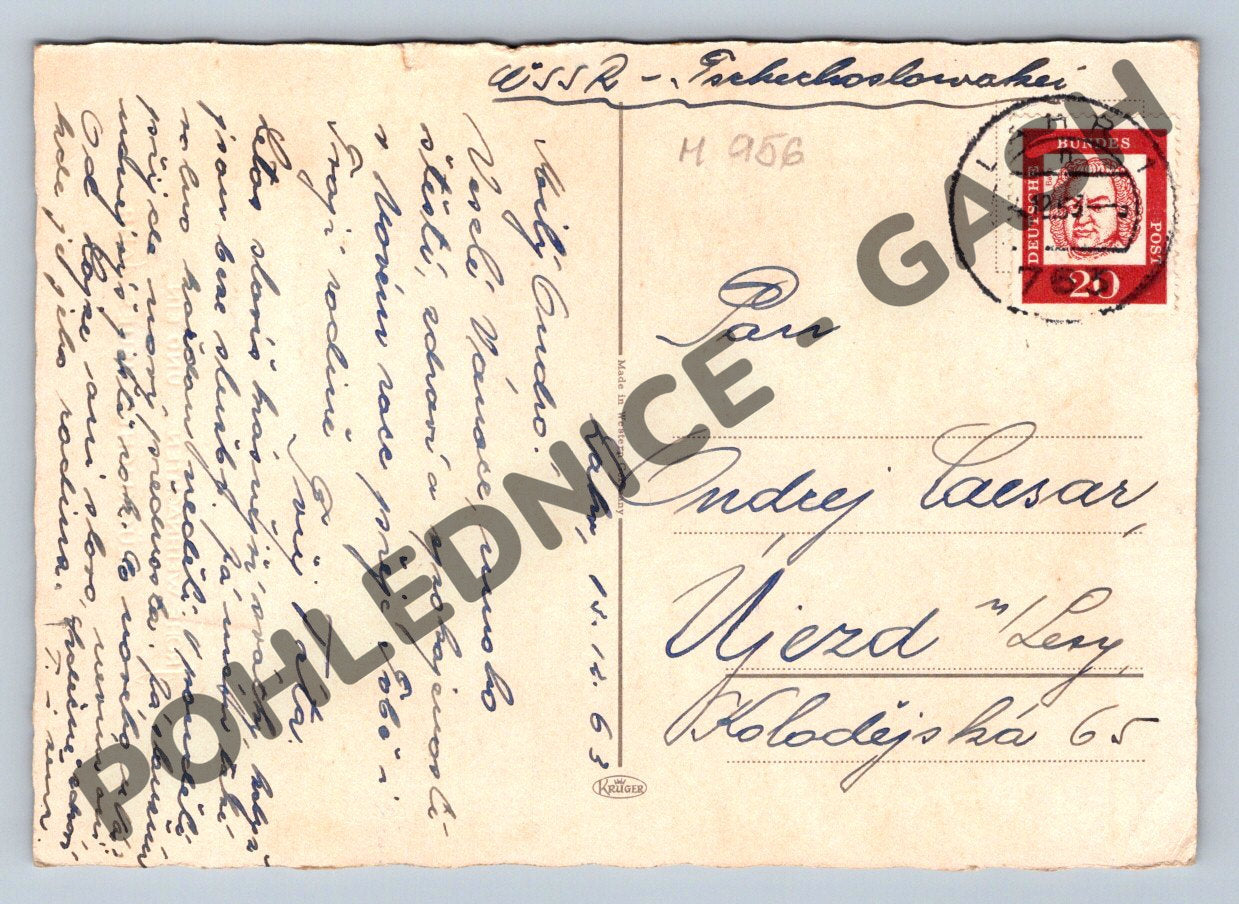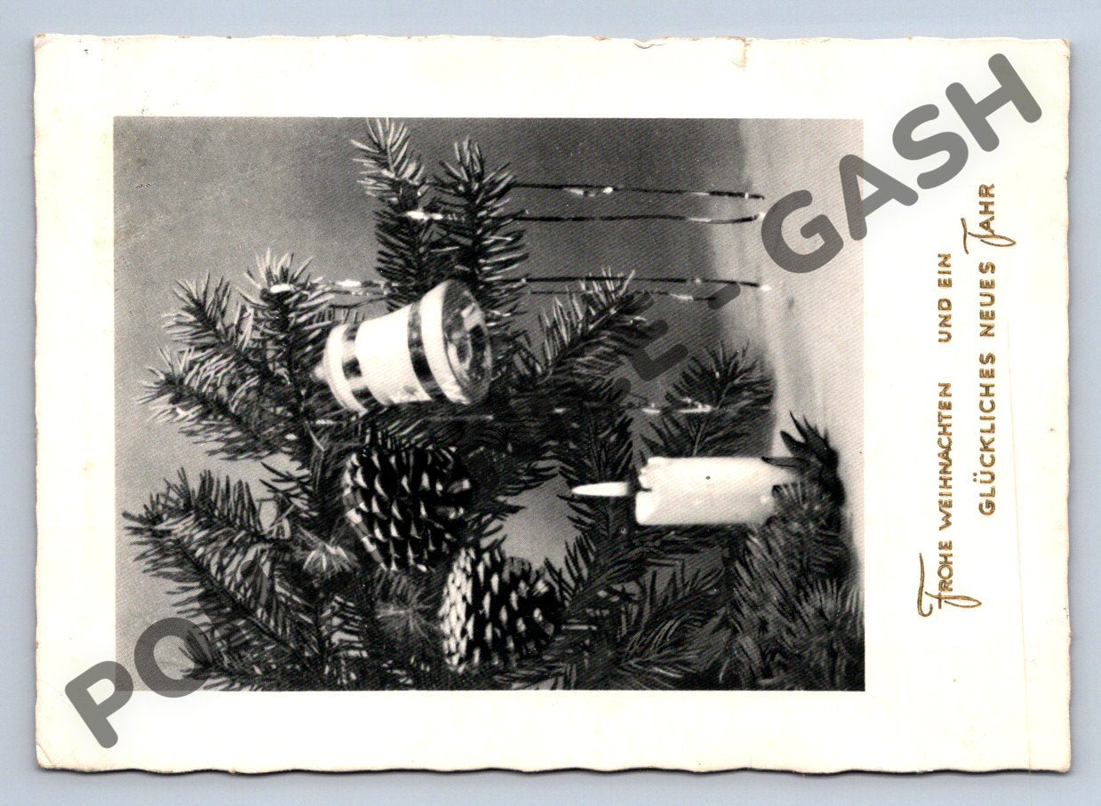 Originální černobílá vánoční pohlednice s motivem větve jehličnatého stromu, ozdobené svíčkami a vánočními ozdobami. Na přední straně je německý nápis Frohe Weihnachten und ein glückliches neues Jahr (Veselé Vánoce a šťastný nový rok). Pohlednice je ručně psaná a prošlá poštou, opatřená německou známkou s portrétem a razítkem, odesláno do tehdejšího Československa. Zadní strana obsahuje osobní text a adresu příjemce. Velmi pěkný stav vhodný pro sběratele historických pohlednic či vánočních témat.