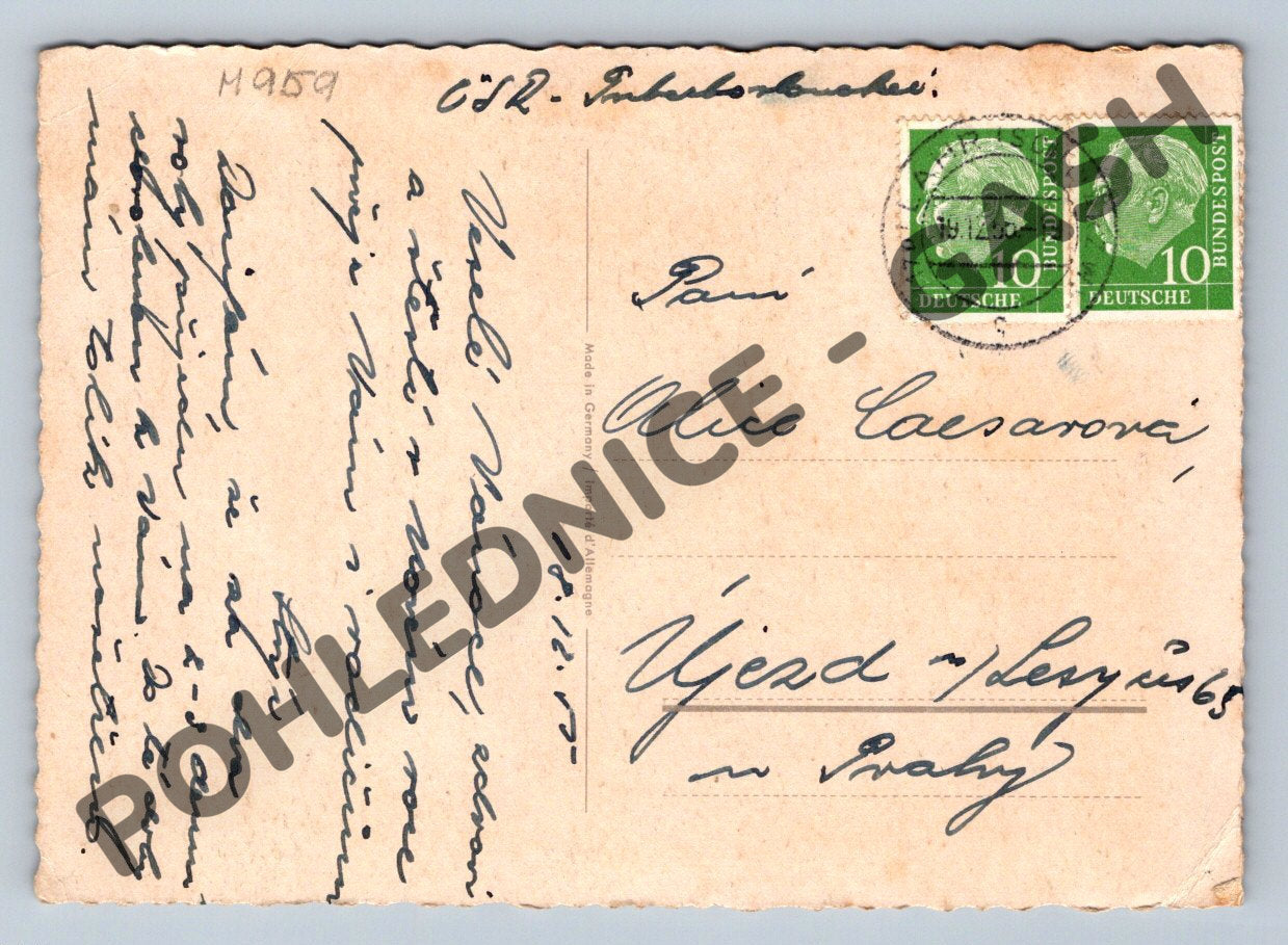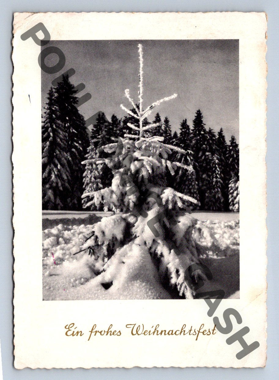 Originální vánoční pohlednice z Německa s černobílou zimní krajinou a přáním Ein frohes Weihnachtsfest na přední straně. Pohlednice byla odeslána v roce 1957, což doloženo razítkem a dvěma německými známkami s nominální hodnotou 10 Pfennig. Na zadní straně je rukopisné věnování v němčině adresované do Čech, konkrétně do Prahy. Krásný sběratelský kousek vhodný jak pro sběratele, tak jako dekorace. Stav odpovídá stáří, lehké opotřebení rohů.