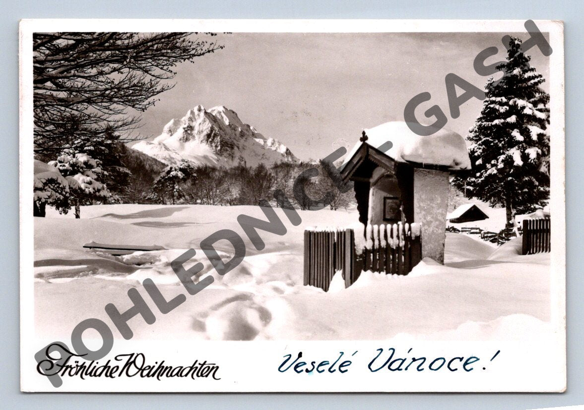 Originální černobílá pohlednice se zimní zasněženou krajinou a horským motivem, doplněná vánočním přáním Fröhliche Weihnachten / Veselé Vánoce. Pohlednice byla zaslaná z Německa v roce 1950 do Československa, což potvrzují poštovní známky a razítko. Na zadní straně je ručně psaný vzkaz a adresa adresátky v Československu. Pohlednice je ve velmi dobrém sběratelském stavu a představuje krásný příklad dobové poštovní korespondence se zimní a vánoční tematikou.