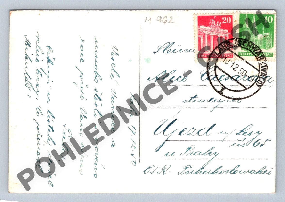 Vánoční pohlednice Německo 1950 – zimní krajina, zaslaná do ČSR