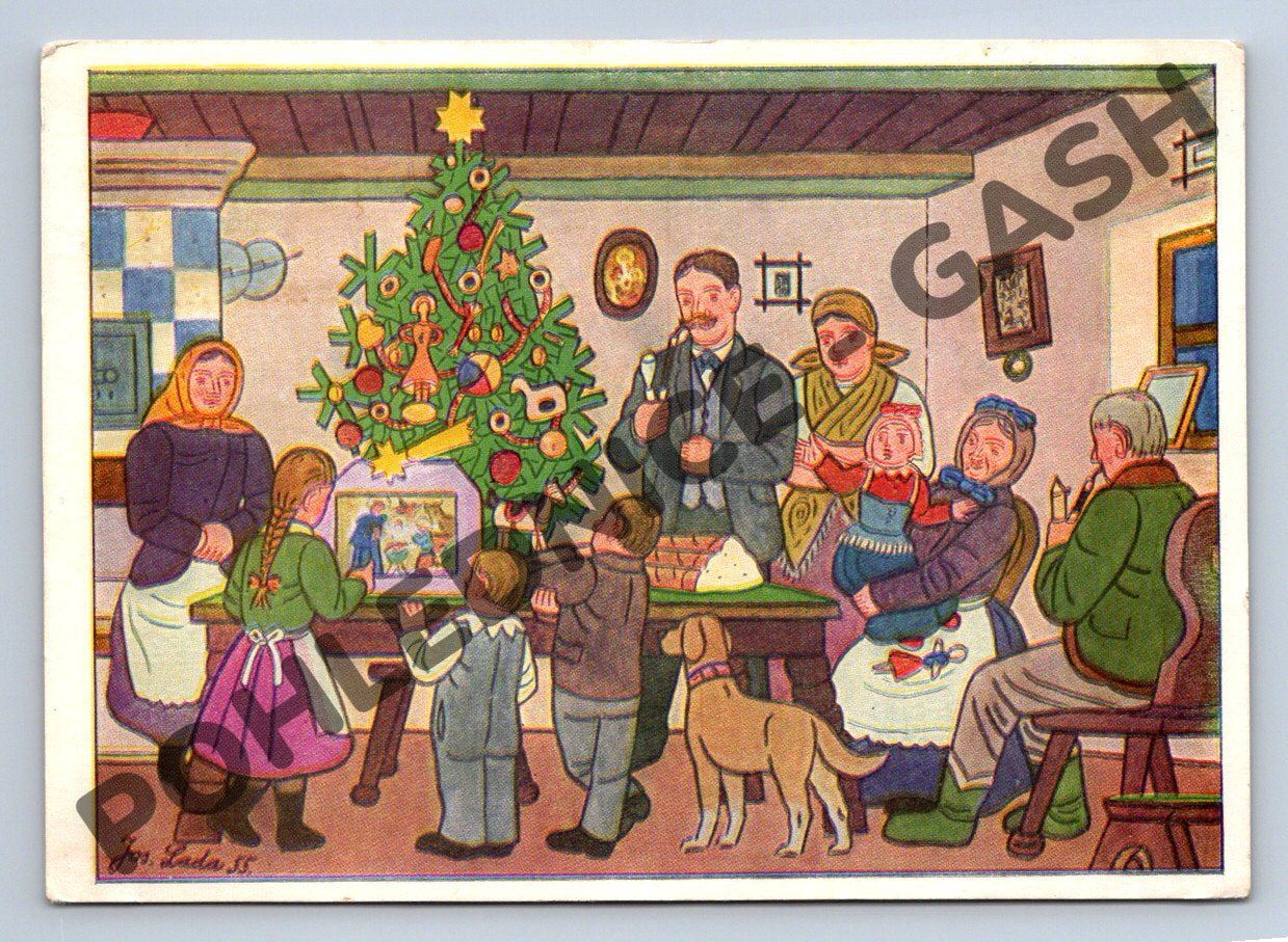 Nabízím originální vánoční pohlednici s motivem rodinné oslavy Vánoc od známého českého malíře Josefa Lady. Pohlednice je kolorovaná, v dolním rohu je podpis autora a rok (1955). Pohled je na použité pohlednici, která byla odeslána v roce 1964 z Československa, na zadní straně najdete krásné ručně psané věnování a dobovou známku. Výjimečný exemplář, který nadchne sběratele ladovských pohlednic i milovníky českých Vánoc a tradic.