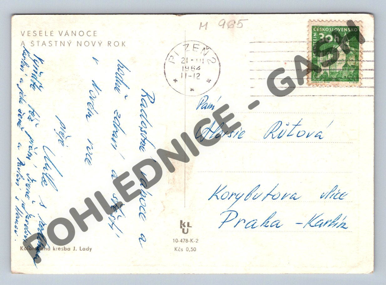 Vánoční pohlednice Josef Lada, kolorovaná, 1964, použité