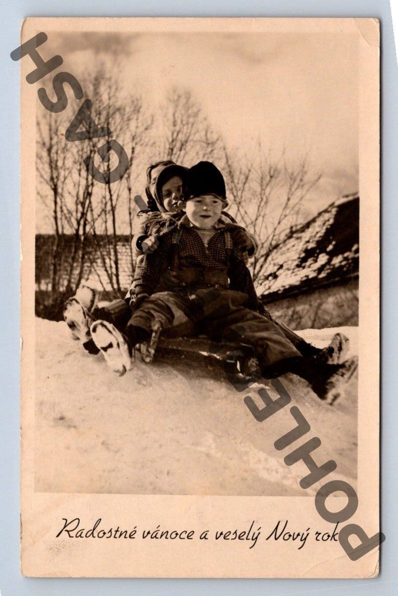 Staré černobílé vánoční a novoroční přání ve formě pohlednice, patrně z období první poloviny 20. století. Na pohlednici je zachycena zimní scéna – dvě děti na saních v zasněžené krajině. Vlevo je napsáno přání: Radostné vánoce a veselý Nový rok. Zadní strana obsahuje ručně psaný vzkaz s adresou i známkou (razítko je nečitelné). Pohlednice je vytištěna vydavatelstvím Orbis, cena původně 0,50 Kčs. Celkově dobrý stav, mírně opotřebované rohy, autentický kousek s atmosférou starých svátků. Skvělý sběratelský artikl pro milovníky historických pohlednic ČR.