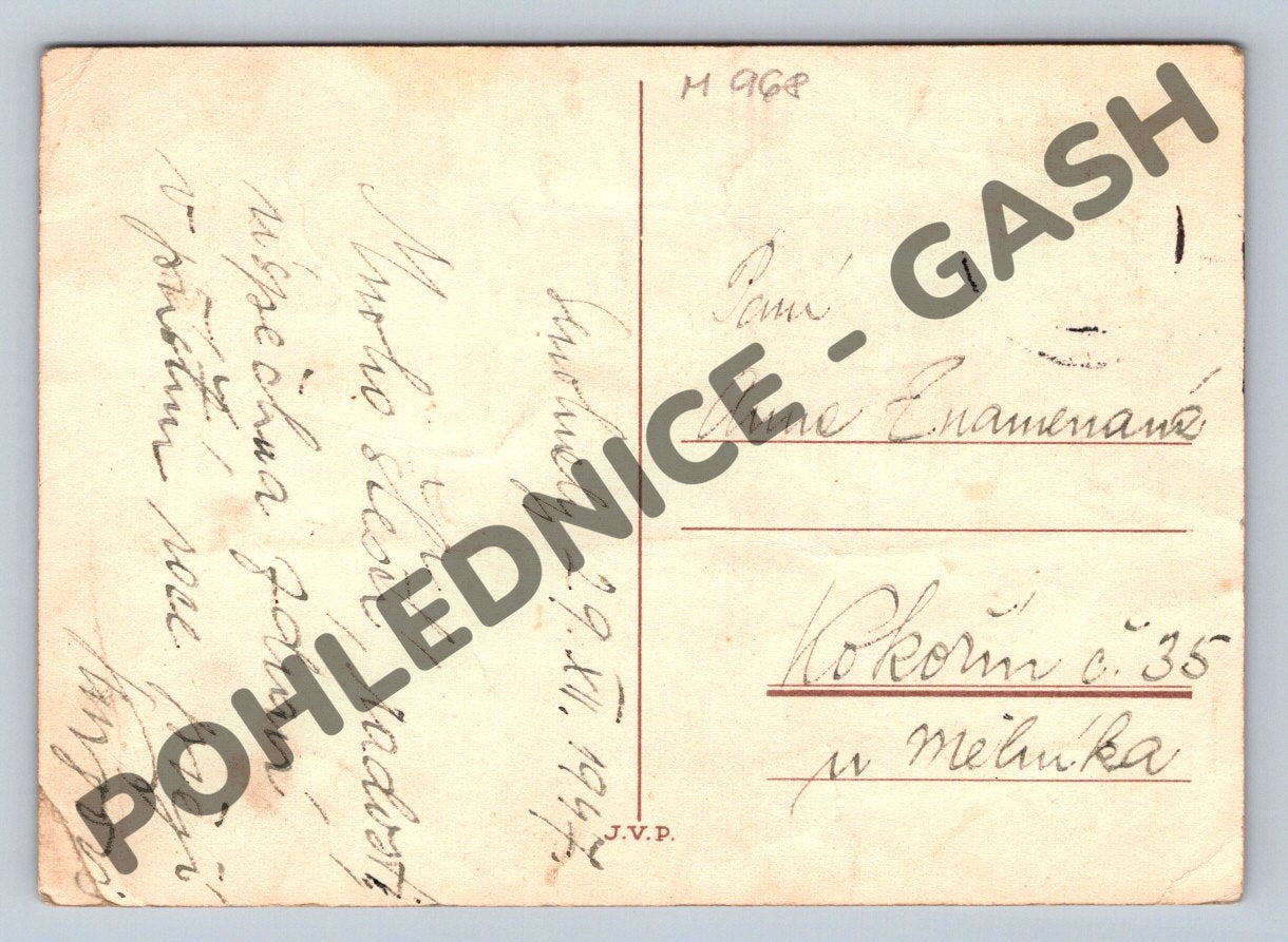Starší česká pohlednice s motivem zimní krajiny a nápisem Veselé Vánoce. Na přední straně je zobrazena postava nesoucí vánoční stromeček zasněženou krajinou, kolem poletují ptáci. Pohlednice je ručně psaná a odeslaná, razítkovaná, s datací 29. XI. 1947. Zadní strana obsahuje adresu a osobní věnování. Pohlednice nese běžné známky stáří a opotřebení na okrajích. Krásný sběratelský kousek z období první poloviny 20. století, vhodný pro milovníky starých pohledů nebo jako milý vánoční dárek.