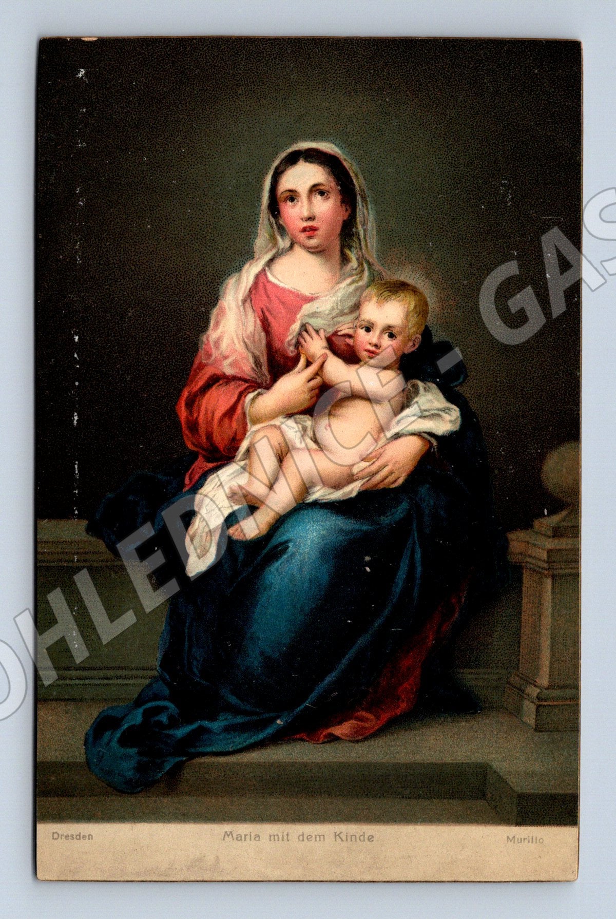 Starší pohlednice s reprodukcí obrazu Maria mit dem Kinde (Panna Maria s dítětem) od slavného španělského barokního malíře Bartolomé Estébana Murilla. Pohlednici vydala firma Stengel & Co., Dresden (číslo 29713), vyrobena v Německu. Na zadní straně krátký popis autora v němčině. Pohlednice má klasické rozměry, je v dobrém dochovaném stavu, neprošlá poštou. Ideální pro sběratele pohlednic s uměleckými motivy a reprodukcemi mistrovských děl.