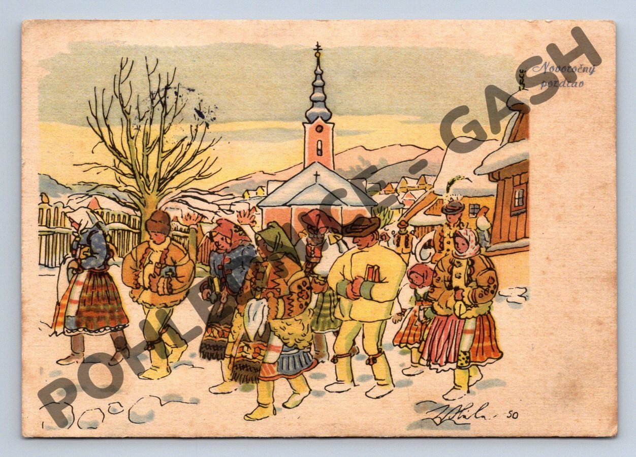 Originální stará pohlednice s názvem Novoroční pozdrav z roku 1950, kterou ilustroval akademický malíř Ján Hála. Pohlednice zachycuje tradiční slovenskou vesnickou scénu v zimě – skupina krojovaných postav jde ke kostelu ve sněhu mezi dřevěnými chalupami, v pozadí je typická lidová architektura a zasněžená krajina. Na zadní straně je ručně psané věnování, adresa a známka Slovensko s razítkem z roku 1951. Skvělý sběratelský kus etnografických a folklorních motivů z poloviny 20. století, vhodný do sbírky i jako dekorace.