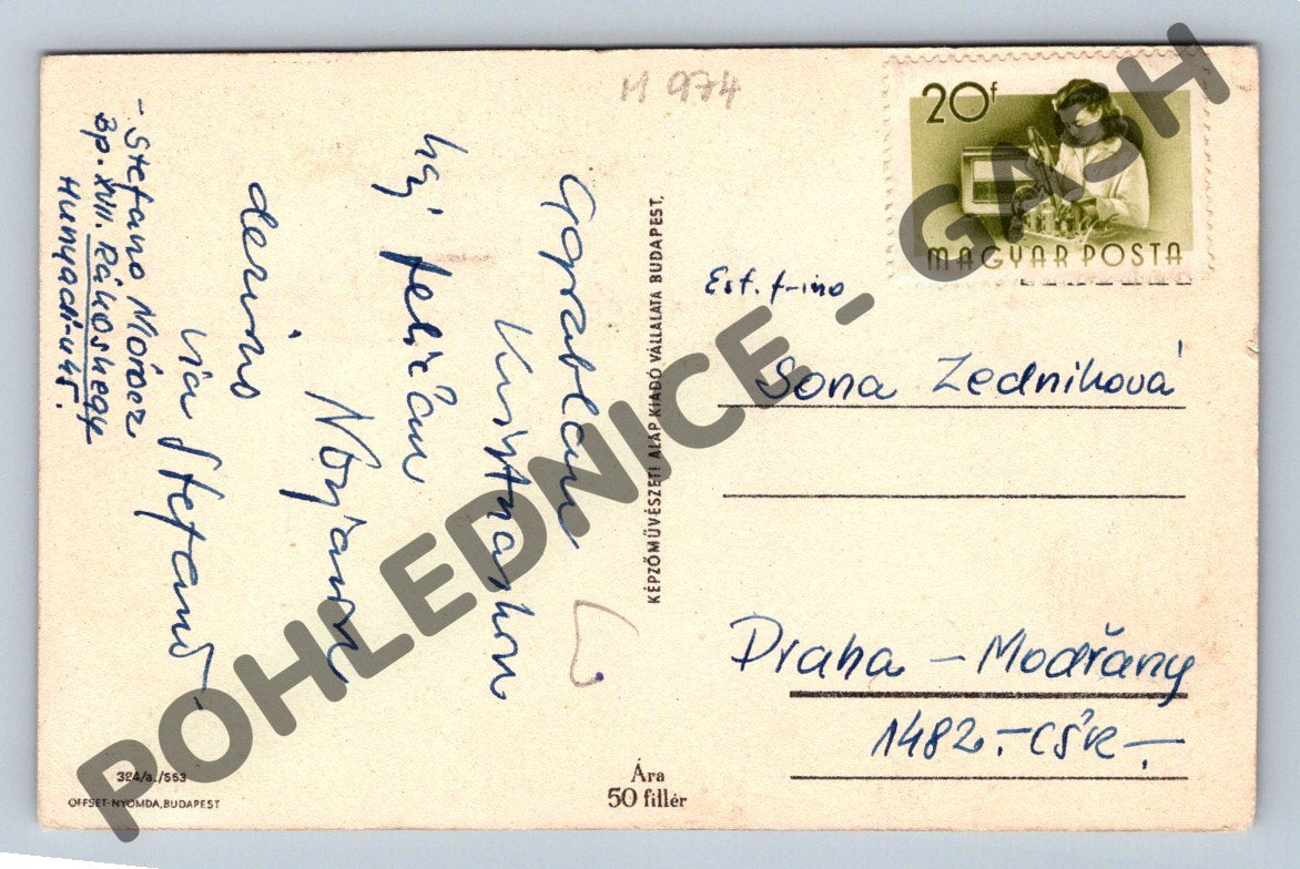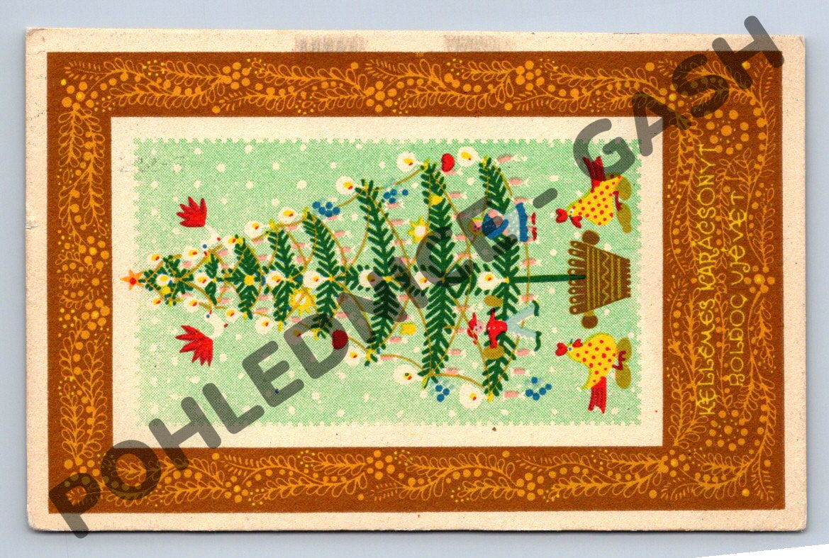 Vánoční pohlednice z Maďarska z období socialismu (pravděpodobně 50.-60. léta 20. století), odeslaná do Československa. Na lícní straně je barevná ilustrace vánočního stromku, zdobeného květinami a folklórními motivy (slepice, postavičky, košík), s bohatou okrovou bordurou. Rubová strana obsahuje původní poštovní známku (20 fillér, Magyar Posta) a ručně psaný vzkaz v maďarštině adresovaný na Prahu. Pohlednice je v zachovalém stavu, s drobnými stopami stáří a používání, vhodná pro sběratele pohlednic s tématikou Vánoc, etnografie či mezinárodních kontaktů.