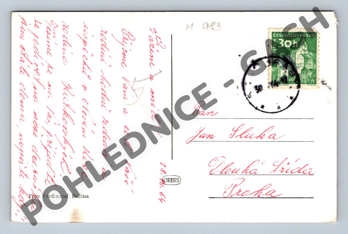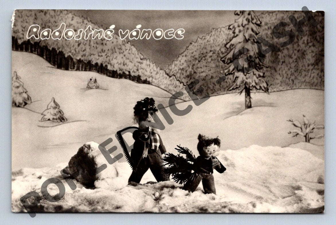 Starobylá česká vánoční pohlednice s textem Radostné Vánoce, zachycující zimní krajinu s dvěma figurkami v zasněžené krajině, pravděpodobně z období před rokem 1950. Foto Ferdinand Bučina. Na zadní straně je ručně psaný vzkaz, adresováno do Prahy, s originální známkou ČSR s razítkem. Formát malý, původní stav, drobné známky použití a stáří. Pohlednice je výjimečná nejen krásnou zimní atmosférou a stylovou ilustrací, ale i osobní historií vzkazu a poštovní známky. Sbírkový kus pro milovníky retro Vánoc a starých pohlednic z Čech.