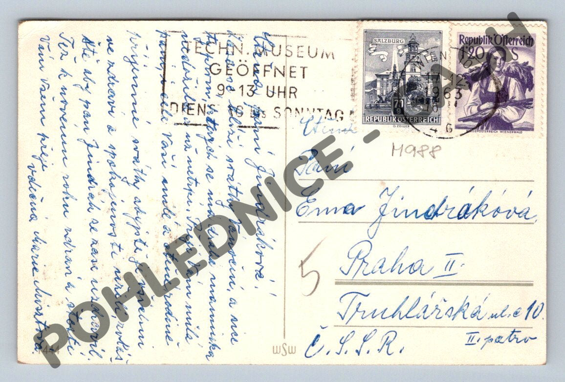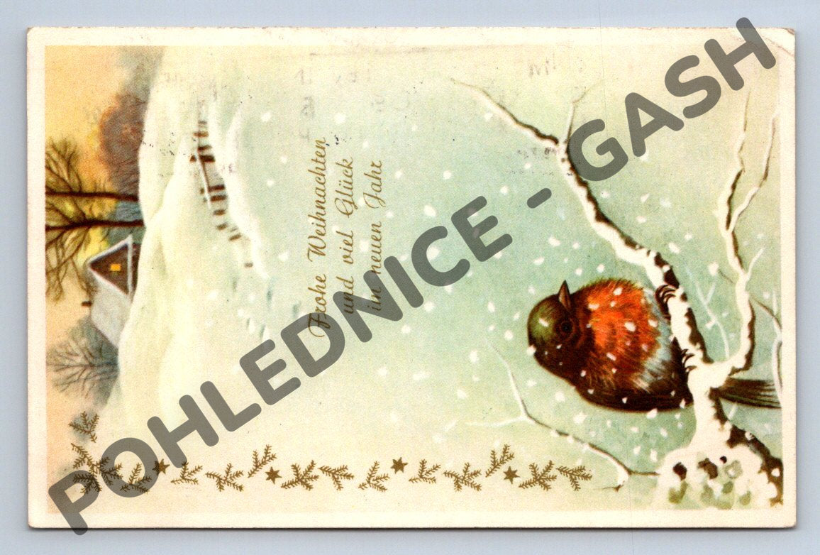 Vánoční pohlednice zaslaná z Rakouska do Československa, datovaná kolem roku 1960. Na přední straně je krásná zimní malba s chalupou, stromem, ptáčkem na zasněžené větvi a německým přáním: Frohe Weihnachten und viel Glück im neuen Jahr (Veselé Vánoce a hodně štěstí v novém roce). Zadní strana obsahuje rukopisný pozdrav v češtině a dvě rakouské poštovní známky (Salzburg, 70g a portrét), včetně čitelného razítka a adresy do Prahy. Pohlednice vhodná pro sběratele vánočních nebo zahraničních pohlednic, zachovalý stav odpovídající stáří, drobné známky opotřebení po okrajích.