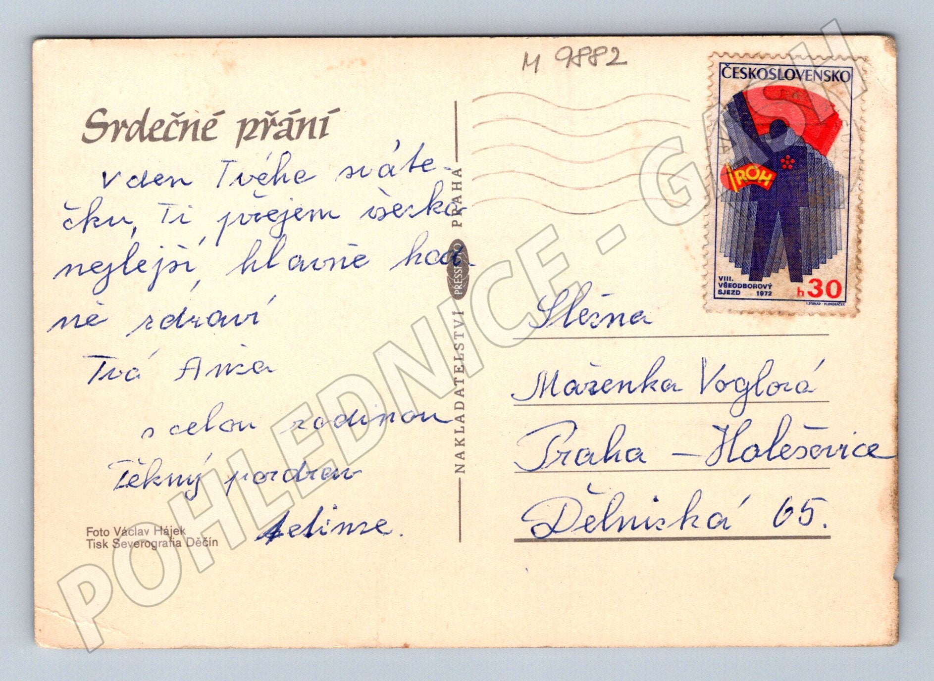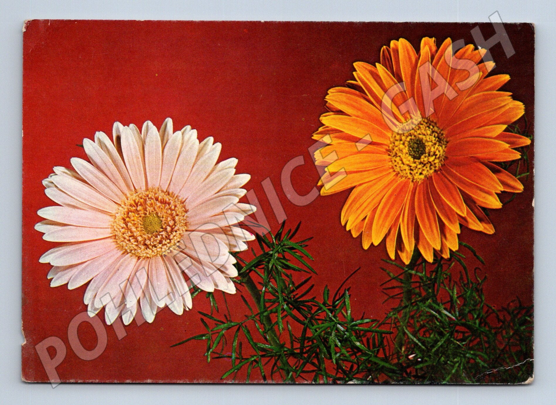 Originální stará pohlednice s motivem dvou květin (gerbery) na červeném pozadí. Pohlednice byla zaslána v rámci Československa, je opatřena známkou z roku 1972 (VIII. Všeborodný sjezd ROH) a ručně psaným přáním k svátku. Razítko i adresace zachována, pohlednice je v zachovalém stavu, nese běžné známky stáří – mírné opotřebení rohů. Autorem fotografie je Václav Hájek, tisk Severografia Děčín. Sbírkově zajímavý exemplář pro milovníky historických československých pohlednic a filatelisty.