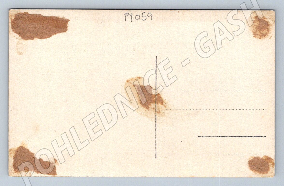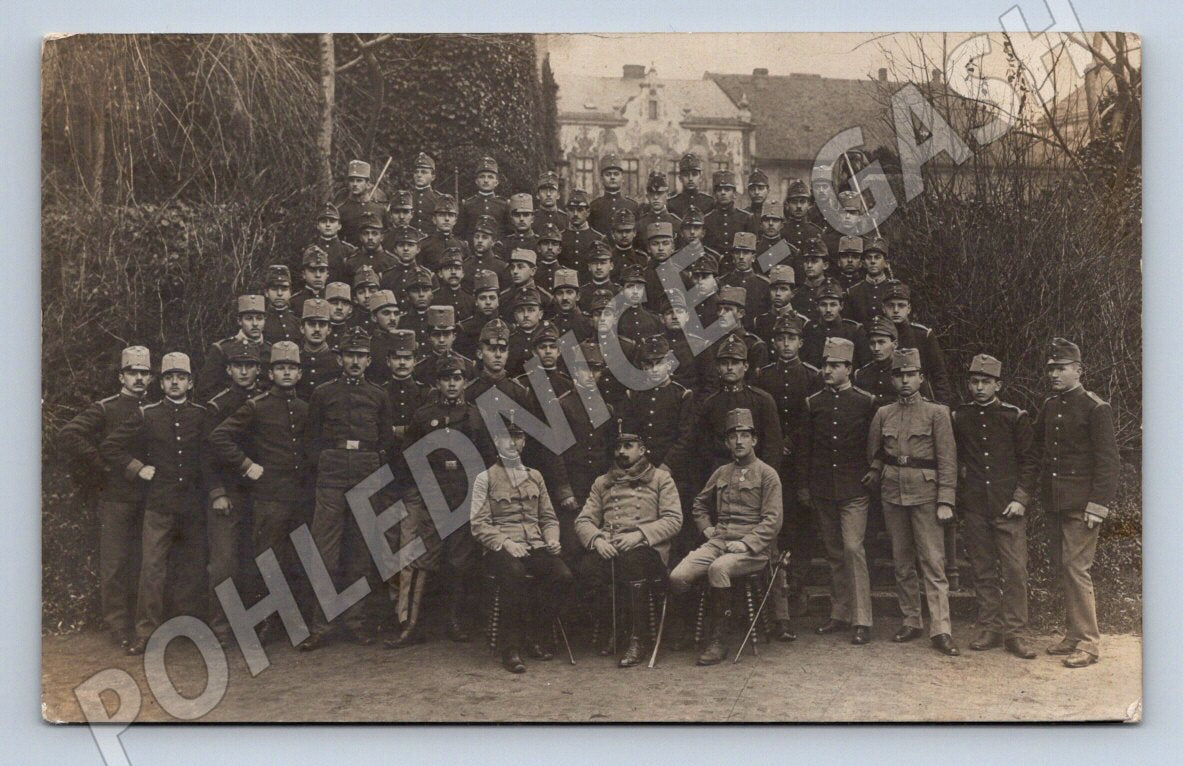 Originální historická pohlednice z období před rokem 1950 zobrazující velkou skupinu vojáků v uniformách, pravděpodobně z doby Rakousko-Uherska nebo první republiky. Pohlednice má klasický malý formát, na zadní straně jsou stopy po lepení a lehké známky stáří. Fotografováno na venkovním prostranství, v pozadí viditelné stromy a zástavba. Vhodné pro sběratele vojenských, historických či českých pohlednic. Stav viz foto.