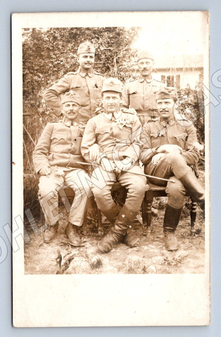 Originální historická pohlednice s motivem skupiny vojáků v uniformách z období první světové války. Foto bylo pořízeno v roce 1918 podle ručně psaného popisu na zadní straně: Casso Fiorentino, Srpen 1918, Itálie. Pohlednice zachycuje vojenskou skupinu v přírodě, což ilustruje každodenní život vojáků během války. Jedná se o sběratelsky zajímavou pohlednici pro milovníky vojenské historie a první světové války, originál, stáří a patina odpovídá době vzniku. Rozměr klasického malého formátu, čistá, bez známky, s místem na adresu. Vhodné k zařazení do sbírky.