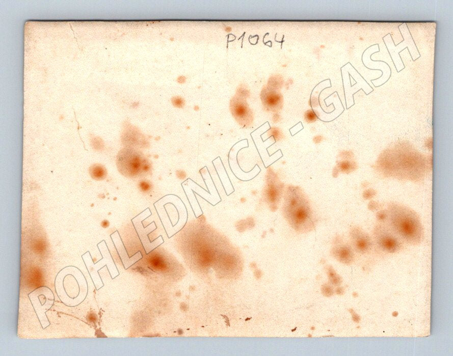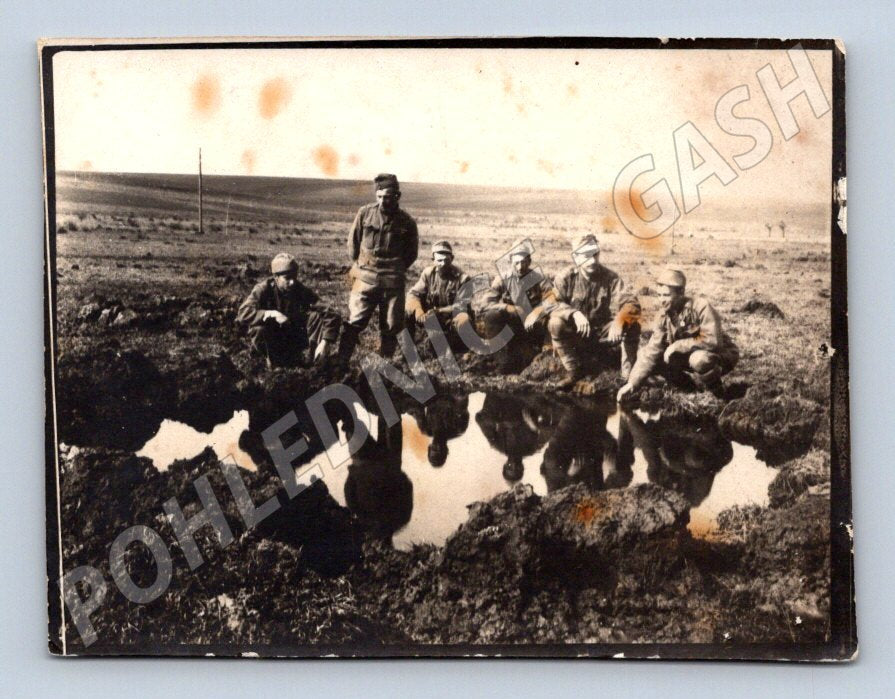 Starobylá černobílá pohlednice menšího formátu, zobrazující skupinu vojáků sedících a stojících na břehu bahnité louže v krajině bez porostu. Pohlednice pochází pravděpodobně z období první poloviny 20. století. Na snímku je možné vidět sedm mužů v uniformách, pravděpodobně vojenských, což naznačuje, že může jít o snímek z období války či vojenského výcviku. Stav pohlednice odpovídá stáří – větší množství rezavých skvrn a zašpinění, avšak fotografie je stále dobře čitelná. Rub je bez potisku, pouze s ručně napsaným číslem a výrazným stářím odpovídajícím poškozením. Pohlednice je vhodná pro sběratele historických fotografií, vojenské tematiky nebo etnografie.