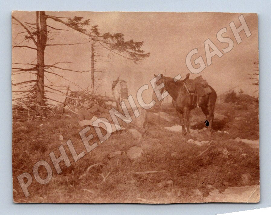 pohlednice dva koně v přírodě ležící voják, LEONAR