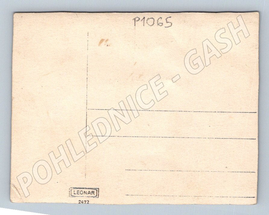 Starobylá pohlednice s motivem dvou osedlaných koní odpočívajících v přírodě vedle ležícího muže. Jedná se o černobílou (sépia) fotografii, která zachycuje dobovou atmosféru venkovské krajiny s jezdci a koňmi v klidné chvíli. Pohlednice nese známky stáří (patina, drobné ohnutí rohů, malé poškození v dolní části) a na zadní straně je číselné označení a výrobní značka LEONAR. Zajímavý sběratelský kousek pro milovníky koní a starých pohlednic.