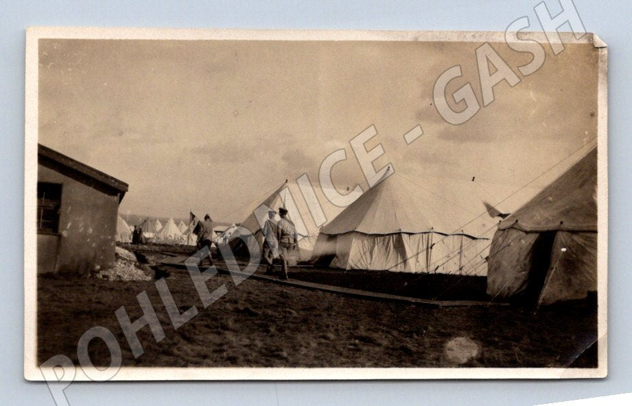 Nabízím starou černobílou pohlednici menšího formátu zobrazující vojenský nebo pracovní tábor s několika stany a postavami lidí ve vojenských či pracovních uniformách. Fotografie zachycuje autentickou atmosféru tehdejší doby. Pohlednice je v původním stavu, na zadní straně je pouze lehké označení tužkou. Ideální pro sběratele historických pohlednic nebo zájemce o vojenskou historii. Viz foto pro detailní stav. Odhadovaná doba vzniku je první polovina 20. století.