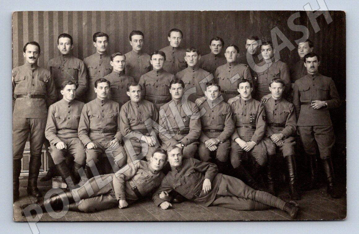 Originální černobílá pohlednice s portrétem větší skupiny vojáků v ruských nebo sovětských stejnokrojích. Pohlednice zachycuje formální skupinový snímek mužstva a důstojníků, pravděpodobně z období první poloviny 20. století. Vojáci pózují v interiéru a většina z nich má na sobě vycházkovou či služební uniformu. Na zadní straně je nápis v azbuce a číslo, pohlednice je nepopsaná a nebyla odeslána. Vyznačuje se zajímavou atmosférou vojenské minulosti, vhodná pro sběratele historických pohlednic, vojenské historie nebo zájemce o ruskou/SSSR tematiku. Stav viz foto, rohy mírně ohnuté, stav odpovídá stáří pohlednice.