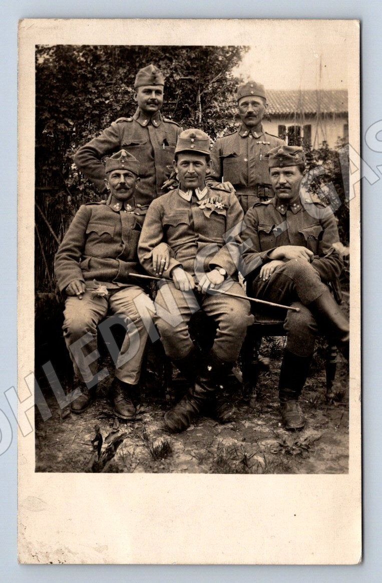 Originální historická pohlednice z období první světové války, datovaná květen 1918. Na přední straně se nachází skupinová fotografie rakousko-uherských vojáků v uniformách, pořízená v Itálii
