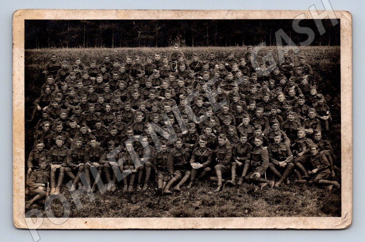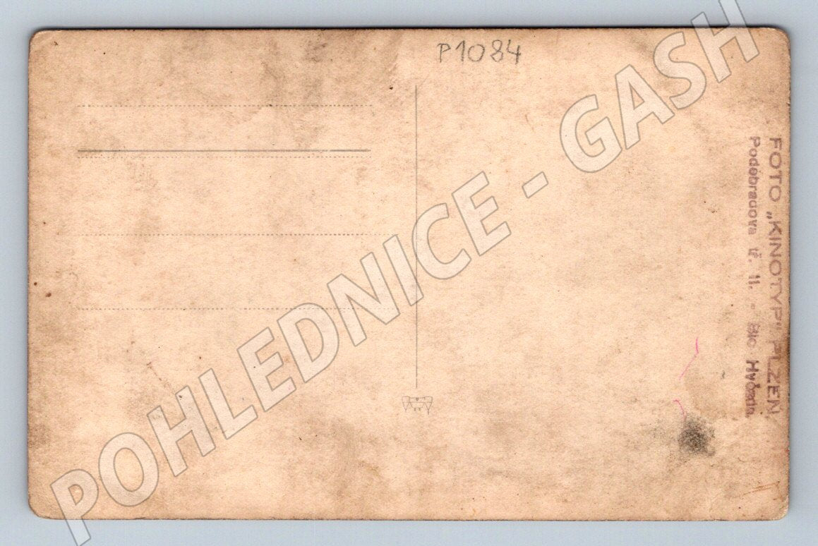 Tato historická pohlednice zachycuje velkou skupinu uniformovaných mužů, pravděpodobně vojáků nebo členů armádní jednotky, sedících a stojících v několika řadách na louce s lesem v pozadí. Pohlednice pochází od fotoateliéru KINOTYP Plzeň, což napovídá částečný nápis na zadní straně. Díky svému stáří nese pohlednice známky opotřebení – mírně ohnuté rohy a zašlou patinu. Zadní strana je klasicky nevyplněná, pouze s předtištěnými linkami pro adresu a zprávu a s katalogovým číslem. Skvělý sběratelský kousek pro milovníky vojenské historie nebo historických pohlednic.