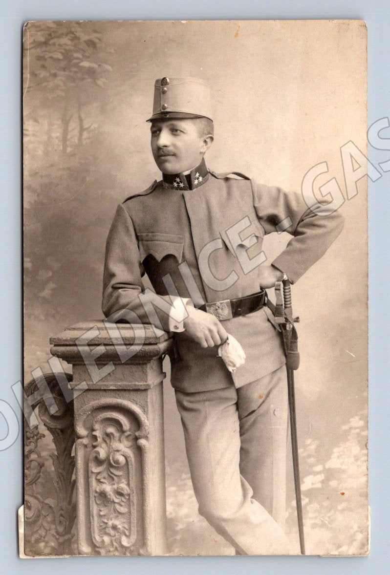 Starobylá černobílá pohlednice s vyobrazením muže v uniformě, patrně rakousko-uherského důstojníka. Fotografická ateliérová kompozice, muž se opírá o zdobené zábradlí a drží v ruce rukavici. Pohlednice nese více známky stáří, zadní strana je potištěná pro korespondenční účely ve více jazycích. Místy jsou na zadní straně patrné stopy po odlepení a poškození v rozích, stav viz foto. Vhodné pro milovníky starých pohlednic, sběratele uniforem či vojenské historie, případně jako dekorace.