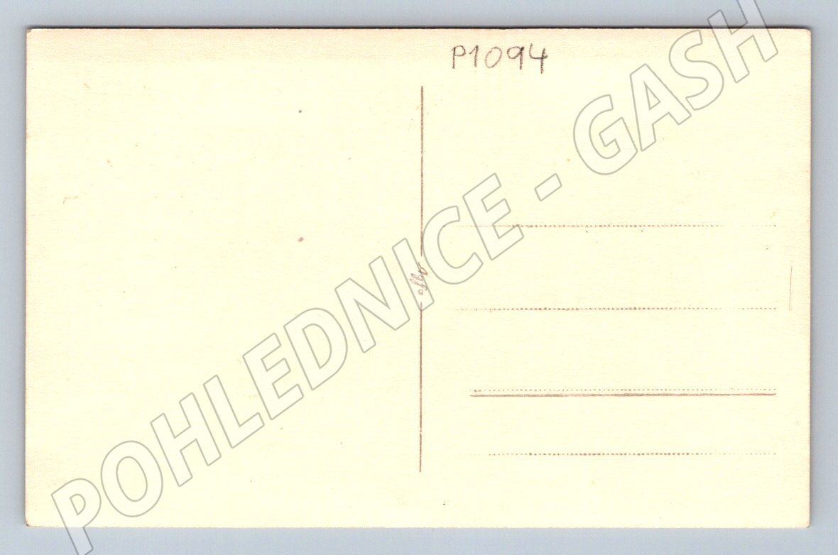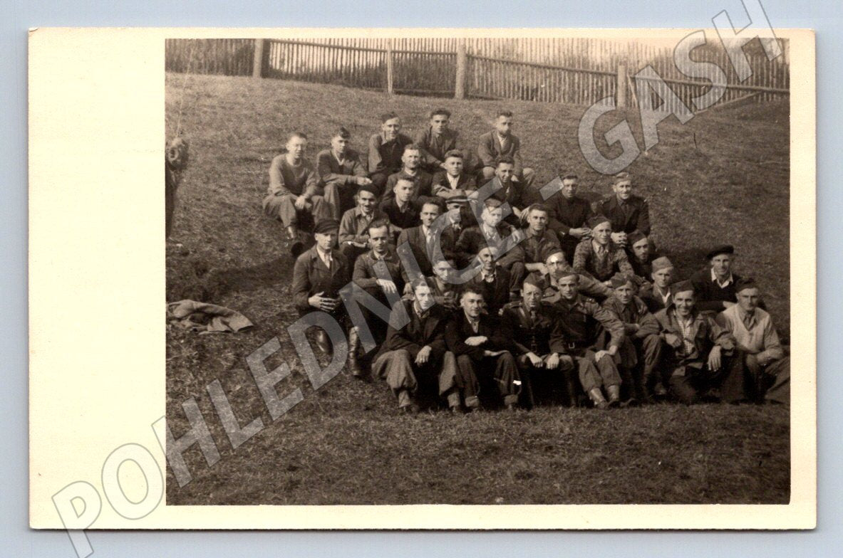 Starší černobílá pohlednice malého formátu zobrazující skupinu mužů sedících na trávě u svahu s venkovským dřevěným plotem v pozadí. Početná skupina je naaranžována ve více řadách, všichni jsou oblečeni v dobovém civilním oblečení. Pohlednice není popsána ani odeslaná, rubová strana je čistá s klasickým dělením na adresu a zprávu. Stav velmi dobrý, fotografie je nepoškozená. Pohlednice může pocházet ze 30. nebo 40. let 20. století a zachycuje atmosféru tehdejšího venkovského či pracovního kolektivu.