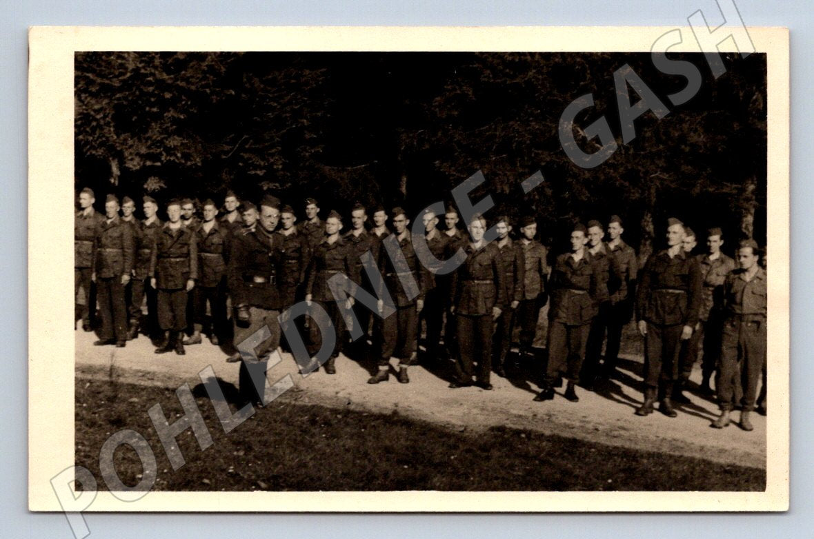 Originální černobílá pohlednice zachycující skupinu mužů v uniformách, pravděpodobně vojenských, ve formaci na venkovní cestě s lesním pozadím. Početná skupina signalizuje hromadné setkání, instruktáž nebo přehlídku. Pohlednice je ve velmi dobrém stavu, s čistou psací stranou, bez popisu či razítka. Skvělý sběratelský kousek pro příznivce vojenských dějin či historických pohlednic z období první poloviny 20. století.