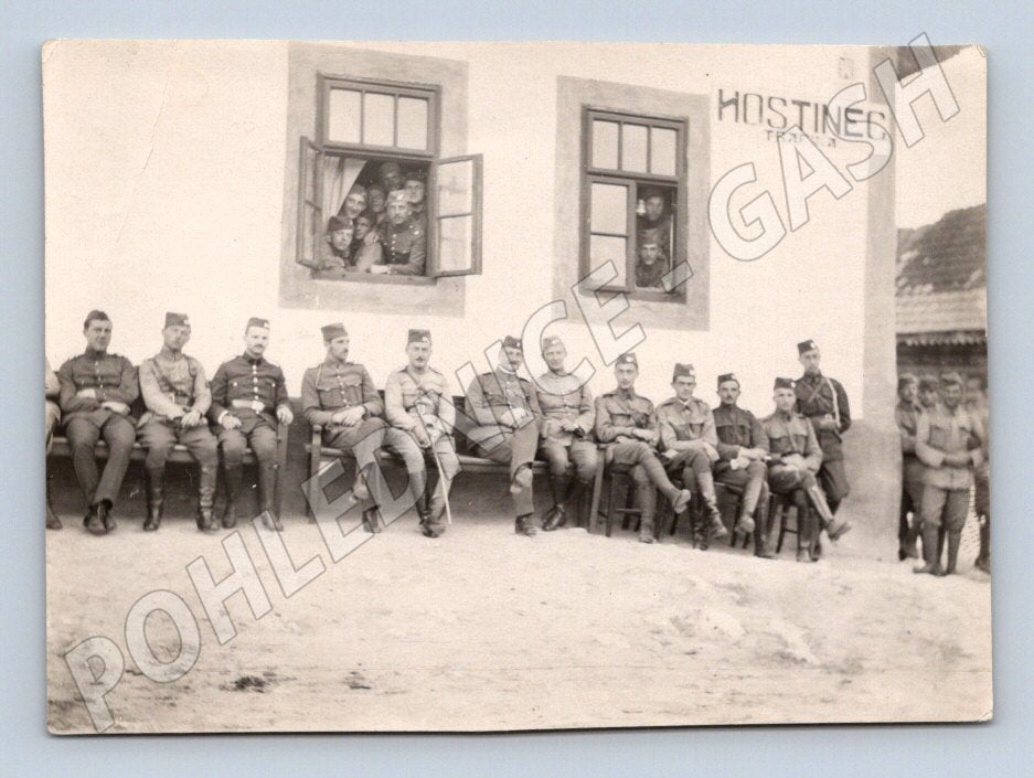 Originální černobílá pohlednice z období první poloviny 20. století zachycující skupinu vojáků sedících před hostincem s nápisem Hostinec Trapina. Na pohlednici je vidět větší skupina mužů v uniformách, další osoby pozorují dění z otevřených oken. Pohlednice není popsaná, Výborný dokument dobového života a vojenského prostředí na území bývalého Československa. Pohlednice je v pěkném stavu, vhodná pro sběratele historických fotografií a pohlednic.
