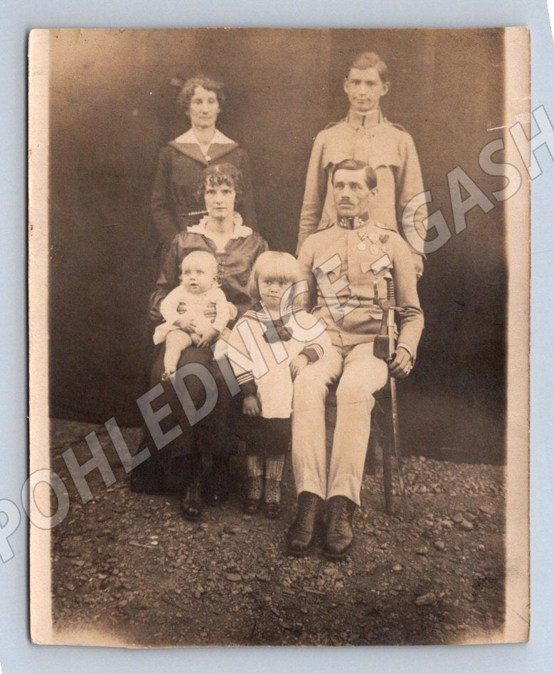 Stará rodinná pohlednice s vojáky a dětmi, začátek 20. století