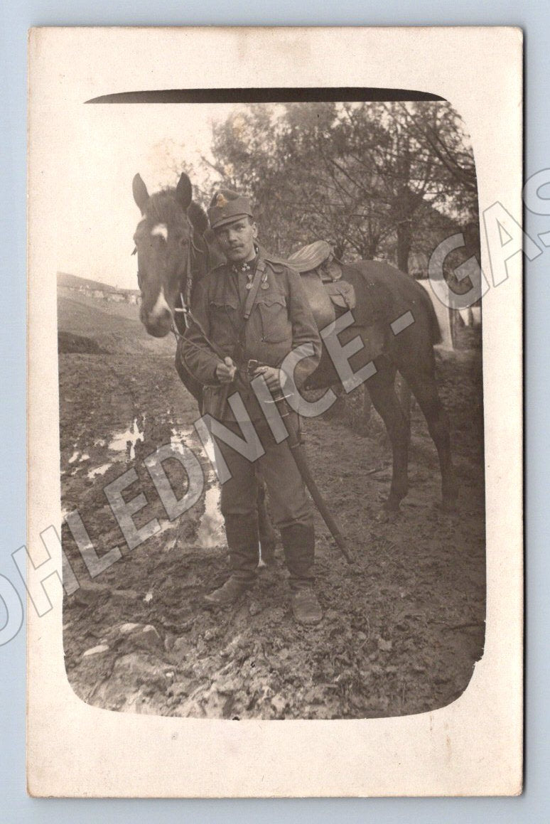 Originální historická pohlednice zobrazující skupinu mužů ve vojenských uniformách a vedle nich stojící vůz tažený koňmi. Pohlednice je ve velmi zachovalém stavu odpovídajícím stáří, na zadní straně bez popisu, pouze poznámka tužkou. Skvělý sběratelský kousek s motivem silniční dopravy z počátku 20. století, který zájemce ocení jak pro vojenskou, tak dopravní tematiku. Na fotografii vyniká nejen uniformní oděv, ale i dobové dopravní prostředky. Vhodné pro sběratele historických pohlednic, dopravy i militárií.