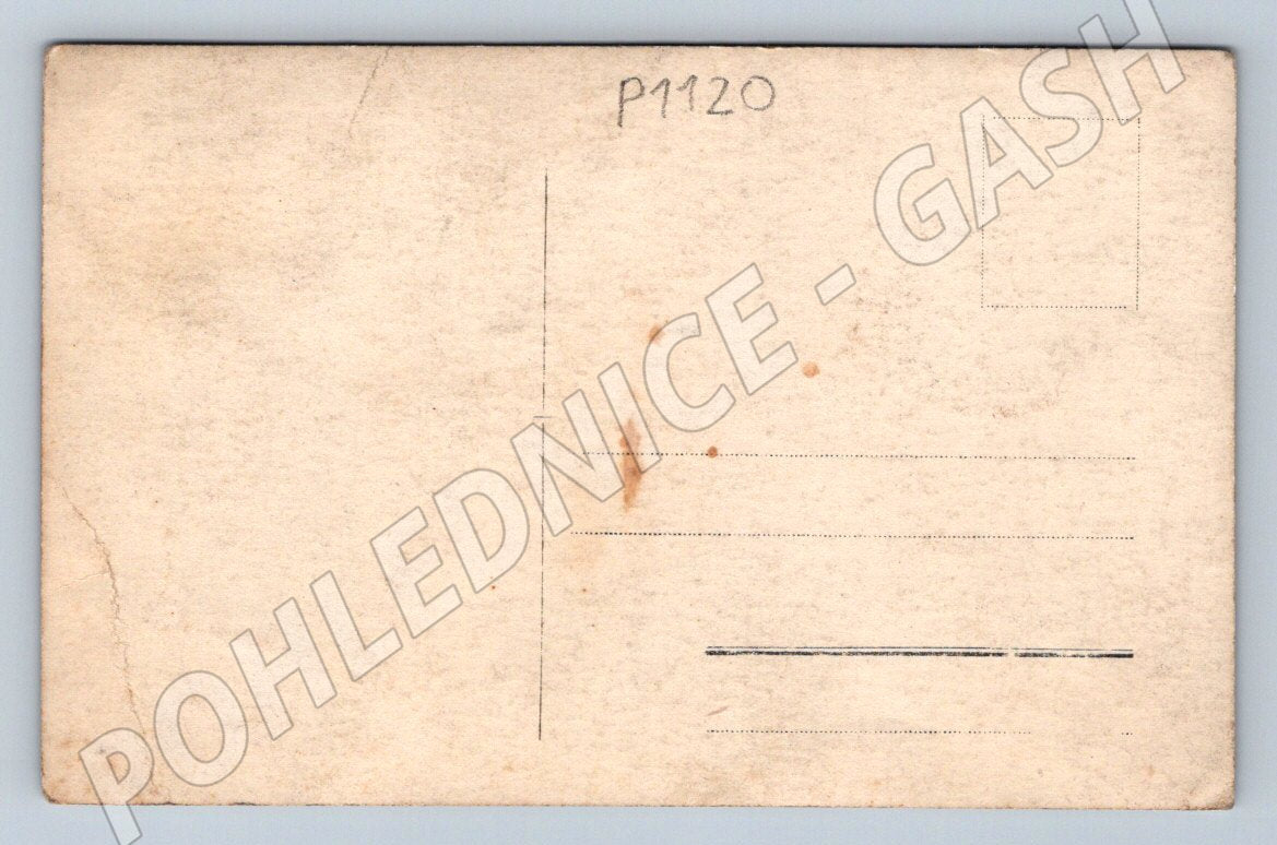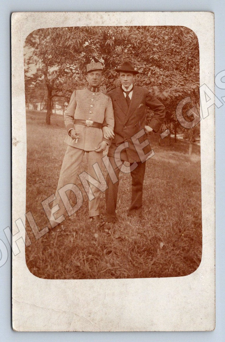 Starý černobílý pohled malého formátu zachycuje dva muže, z nichž jeden je v dobové uniformě a druhý ve společenském obleku. Pohlednice je zřejmě z období první poloviny 20. století. Fotografie je situována v exteriéru, pravděpodobně v parku nebo zahradě, a vyznačuje se autentickou atmosférou své doby. Na zadní straně pohlednice jsou lehké známky stáří a drobné skvrny, jinak je zadní strana čistá bez psaného textu, pouze s číslem PM120. Výborný sběratelský kus pro milovníky starých pohlednic a české historie.