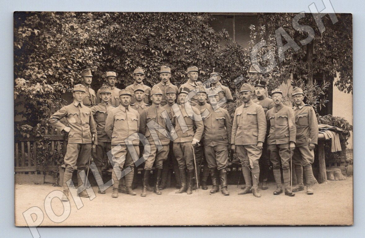 Stará černobílá pohlednice malého formátu z období první poloviny 20. století, zobrazující skupinu vojáků v uniformách rakousko-uherské armády. Snímek je pořízen v exteriéru, pravděpodobně během 1. světové války. Na zadní straně ručně psaný vzkaz a rakousko-uherská poštovní známka v hodnotě 5 fillerů. Pohlednice byla adresována do města Eger (dnes Cheb) v tehdejším Uhersku. Skvělý historický dokument dokladující vojenský život v tehdejší době. Výborný sběratelský kus pro milovníky vojenské historie a starých pohlednic.