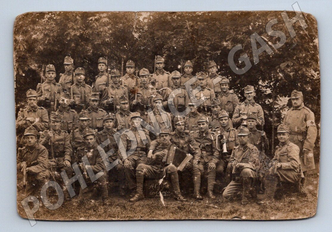 Nabízím starou dobovou pohlednici zobrazující skupinu vojáků v uniformách z období první světové války. Na snímku je větší skupina mužů, kteří pózují před stromovou kulisou, včetně jednoho muže se zdravotnickou páskou na rukávu, několika hudebních nástrojů a dekoračních medailí. Na zadní straně pohlednice je ručně psaný text, který je již těžko čitelný. Stav odpovídá stáří a používání, značné opotřebení, patrné otěry a zašpinění. Jedinečný dobový dokument vhodný pro sběratele vojenské historie nebo zájemce o politiku a vojenství.