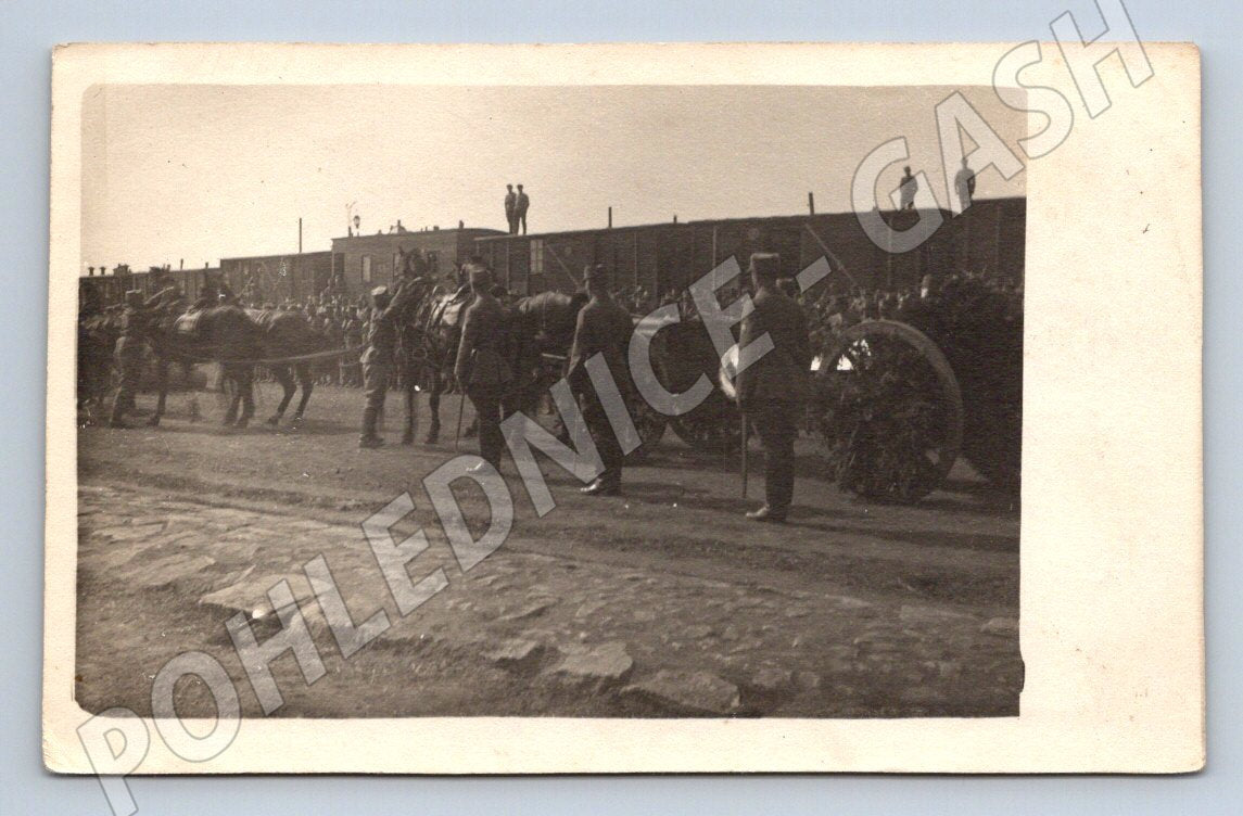 Pohlednice vojenský průvod koňské povozy železniční doprava (P1161)