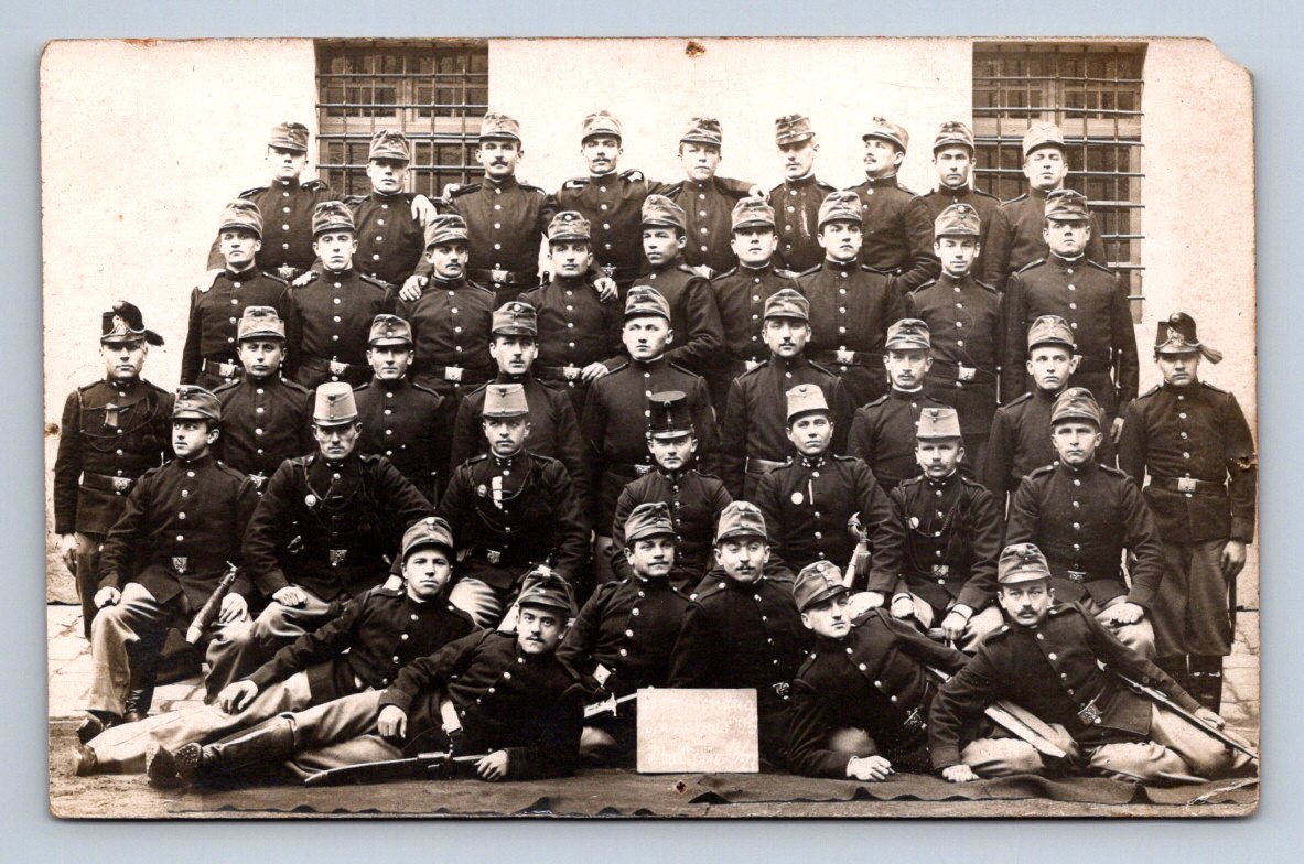 Originální stará černobílá pohlednice , na které je zachycena skupina uniformovaných vojáků, pravděpodobně z Rakousko-Uherska nebo první republiky. Vojáci jsou naaranžováni ve více řadách před budovou s mřížovanými okny. Pohlednice byla vydána Josefem Richterem z Leitmeritz a. Elbe (dnešní Litoměřice). Na zadní straně naleznete vícejazyčný univerzální popis, pohlednice je neprošlá poštou, s mírnými stopami stáří a opotřebení, včetně drobných skvrn a otřepení rohů. Zajímavý sběratelský kousek z období před rokem 1950, vhodný do sbírky vojenské historie či kartofilie.