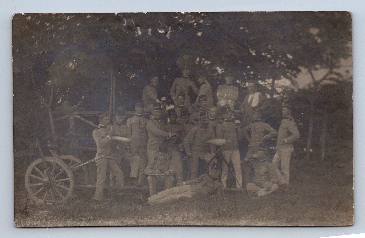 Nabízím starou pohlednici menšího formátu, která zachycuje skupinu vojáků v uniformách zřejmě z období Rakouska-Uherska. Snímek byl pořízen v exteriéru, kolem jsou stromy a vlevo je vidět vojenský vůz. Na fotografii je větší skupina osob, většinou stojících nebo sedících, některé z nich mají vojenské čapky a výstroje, což z ní činí zajímavý dokument vojenského života začátku 20. století. Pohlednice má klasické rozdělení na adresu a zprávu a na zadní straně nechybí ani vícejazyčný popis (Česky, Německy, Francouzsky aj.). Stav odpovídá stáří – pohlednice nese drobné známky opotřebení, ohyby v rozích a lehké zašpinění. Vhodná do sbírky nebo jako dárek pro milovníky historických a vojenských pohlednic.