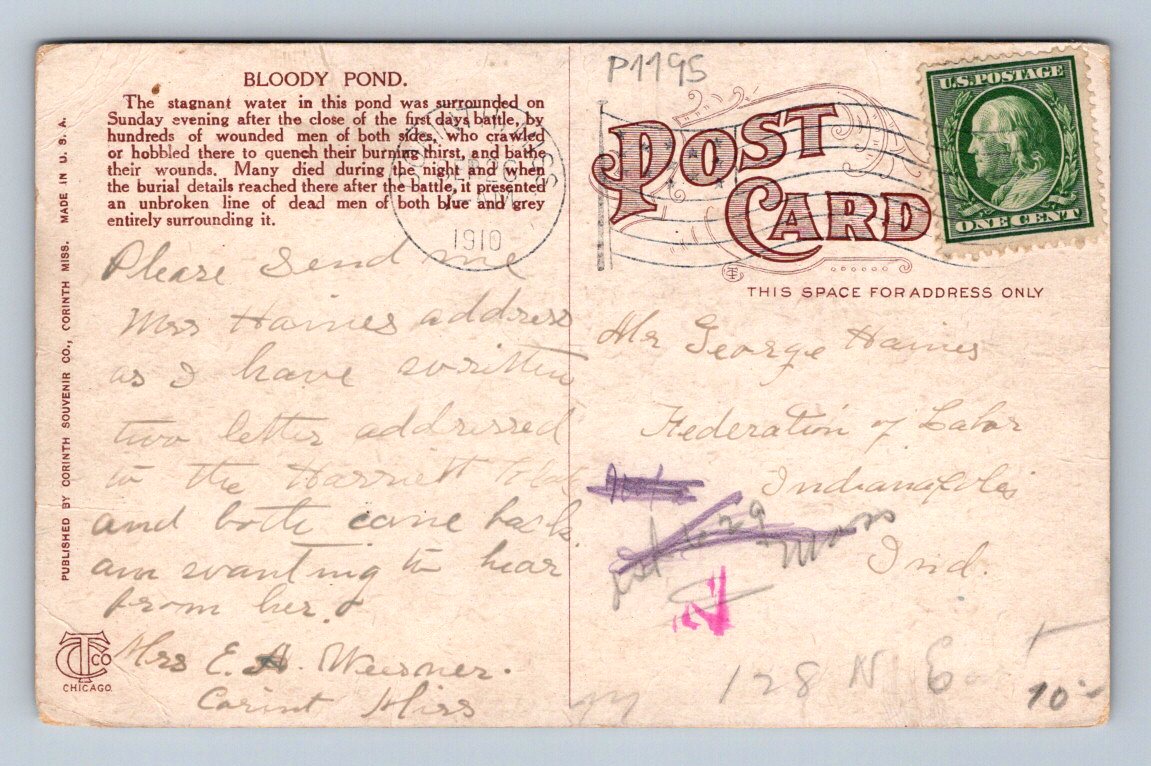 Originální historická pohlednice ze Spojených států amerických, zobrazující Bloody Pond v Shiloh Parku, místa slavné bitvy u Shilohu během Americké občanské války. Na pohlednici jsou vyobrazeny pamětní děla a klidná parková krajina u rybníka, který má tragický význam v dějinách USA. Pohlednice pochází z období začátku 20. století, byla poslána v roce 1910 a je opatřena originální americkou poštovní známkou s nominální hodnotou 1 cent. Zadní strana obsahuje ručně psaný text a sběratelská razítka. Krásný sběratelský kousek pro milovníky historie a americké filokartie.