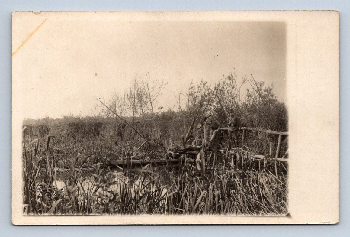 Vojenská pohlednice – venkovská krajina, plot, muži, etnografie