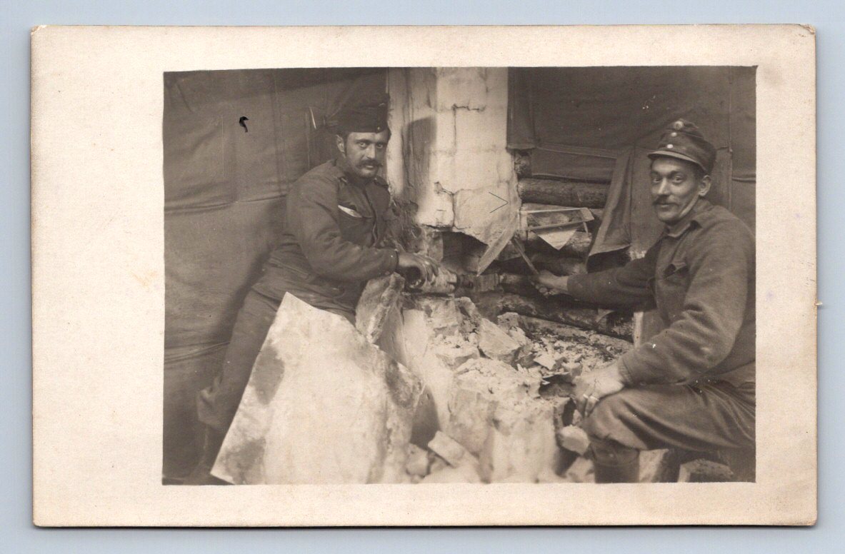 Historická černobílá pohlednice zachycující dva muže v uniformách při práci v interiéru, pravděpodobně z období první světové války. Muži sedí u rozbořené zdi a smějí se na kameru. Okraje pohlednice nesou známky stáří a drobné poškození. Rubová strana je nevyplněná a určená pro poštovní odeslání. Pohlednice je zajímavým svědectvím každodenního života v minulosti a etnografickou památkou na vojáky té doby.