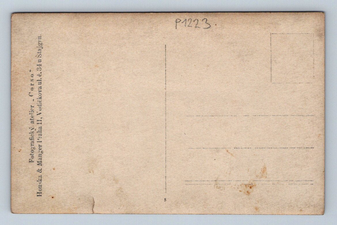 Historická černobílá pohlednice zobrazující skupinu vojáků v uniformách před venkovským domem, pravděpodobně z období Rakousko-Uherska či první republiky. Jedná se o autentickou fotografii z fotografického ateliéru Corso, Houska & Mainzer, Praha. Na rubu pohlednice jsou jemné stopy používání, drobné flíčky a vyblednutí, což odpovídá jejímu stáří. Pohlednice je bez známky a nebyla dosud odeslaná. Skvělý sběratelský kousek pro milovníky historických militarií nebo atmosféry počátku 20. století.