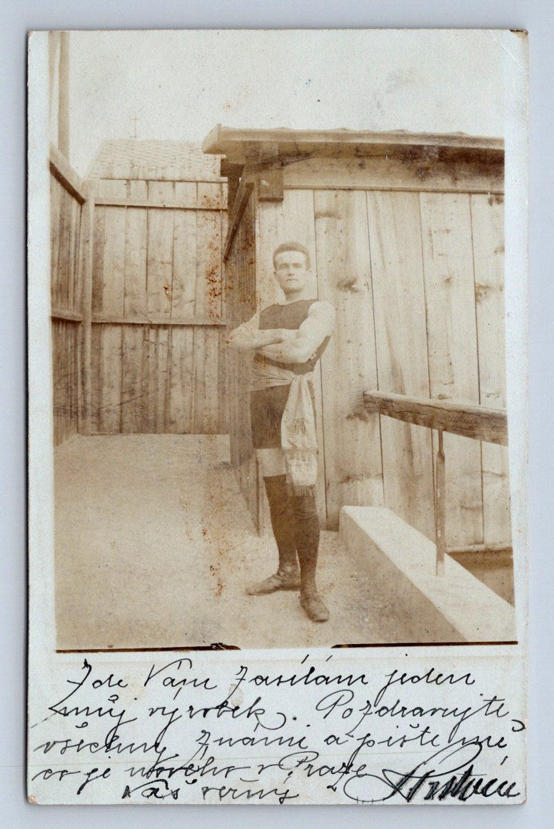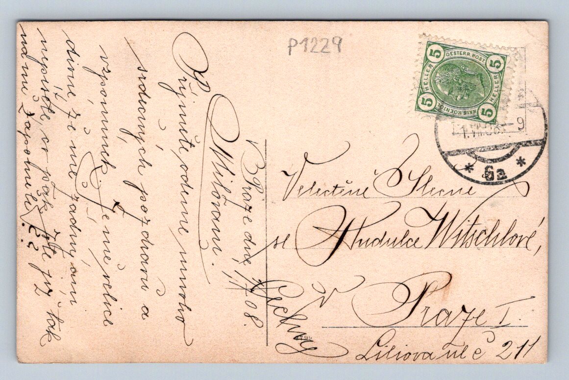 Starobylá pohlednice z období Rakouska-Uherska, zaslaná poštou do Prahy. Na přední straně pohlednice je autentická dobová fotografie muže stojícího u dřevěné stavby. Na okraji fotografie je ručně psaný vzkaz. Zadní strana obsahuje ručně psané adresování, text v češtině a originální známku Rakousko-Uhersko v hodnotě 5 Hellerů s dobře čitelným razítkem. Jedná se o cenný sběratelský kousek ze začátku 20. století. Pohlednice nese znaky stáří a dobové autenticity, vhodné pro sběratele historických pohlednic či milovníky historie českých zemí.