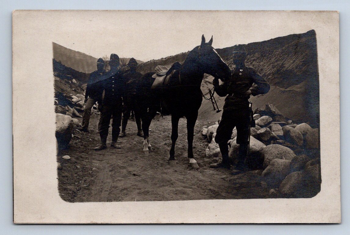 Staré vojenství – vojáci s koněm v horách, černobílá pohlednice