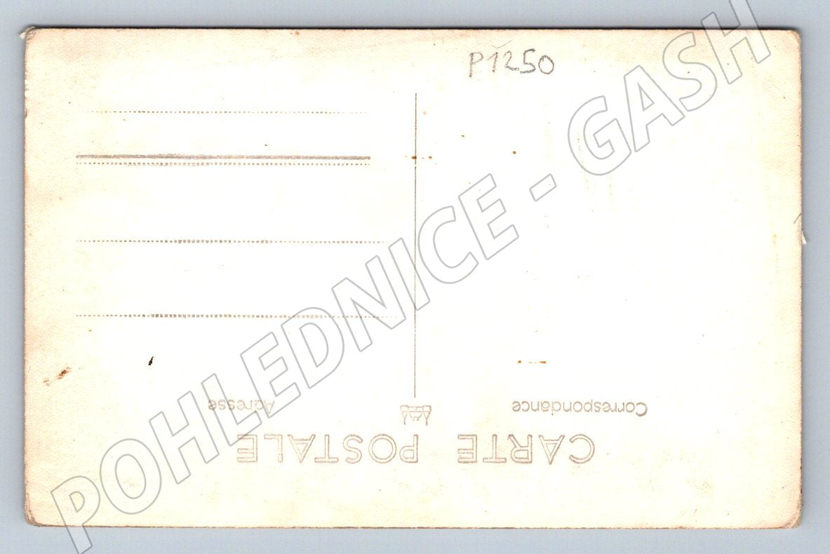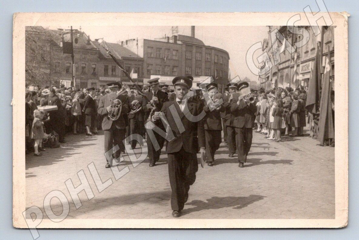 Originální černobílá pohlednice zachycující průvod s dechovou kapelou na náměstí českého města. Pohlednice pochází z období první poloviny 20. století, odhadem do roku 1950. Na snímku jsou vidět uniformovaní hudebníci, děti i dospělí přihlížející slavnostnímu pochodu, silná atmosféra dobové oslavy či akce. Stav viz foto, lehké známky stáří na okrajích, zadní strana čistá, nerozeslaná. Krásný dobový dokument do sbírky českých pohlednic městského života.