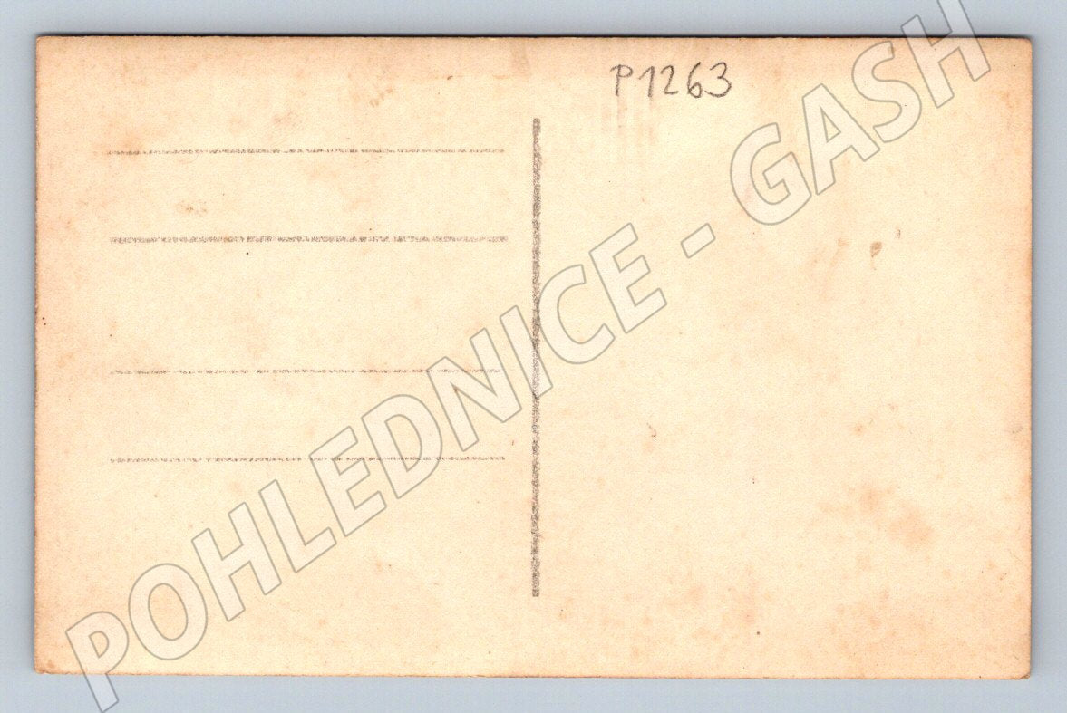 Originální stará černobílá pohlednice menšího formátu, datovaná odhadem do první poloviny 20. století (před rokem 1950). Na fotografii je skupina osob – pravděpodobně skautů, žáků nebo mládeže – stojících před jednopodlažní budovou s několika komíny a křížem na střeše (možná škola, fara nebo kulturní dům). Fotografická strana je výrazně orámována tmavou vinětací. Rubová strana má klasické rozvržení na adresu a zprávu, nevyplněná, s číslem P1263 nahoře. Pohlednice je v solidním sběratelském stavu, lehce zažloutlá a místy opotřebovaná stářím. Výborný kousek pro sběratele historických pohlednic nebo zájemce o historii regionu.